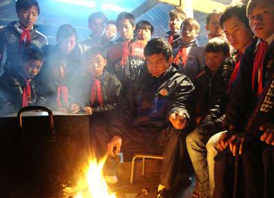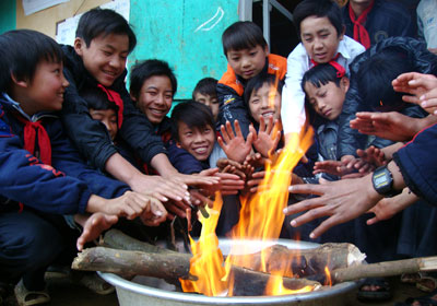 | Tranh thủ giờ nghỉ giữa giờ, nhiều học sinh xuống nhà bếp sưởi ấm. |