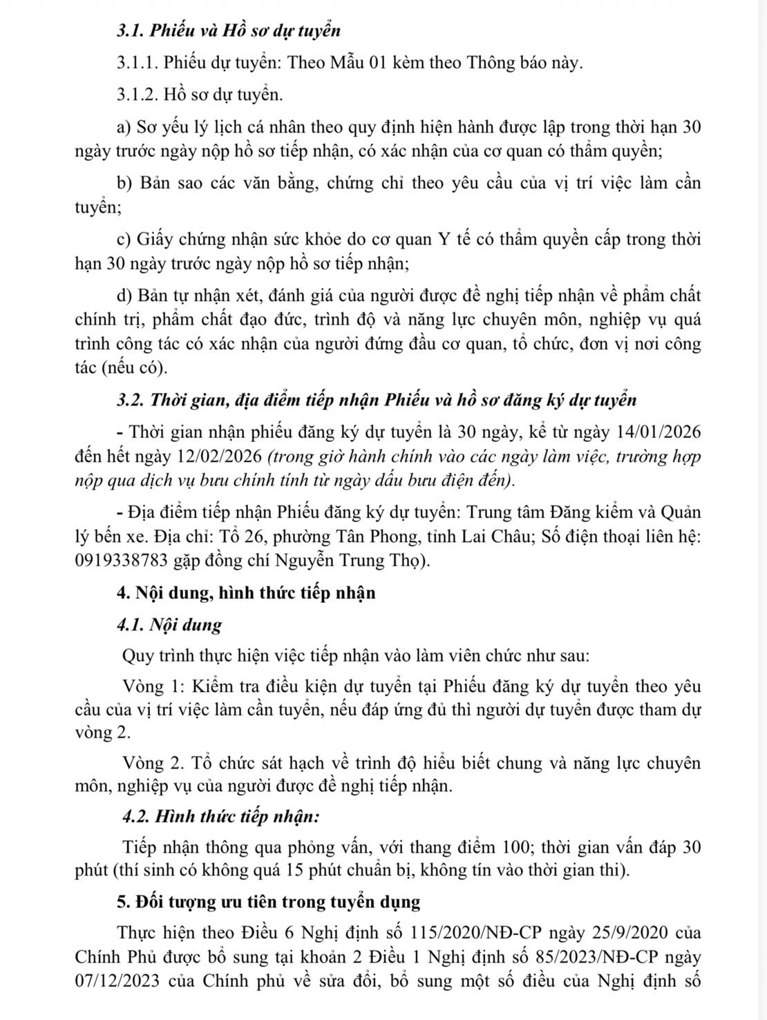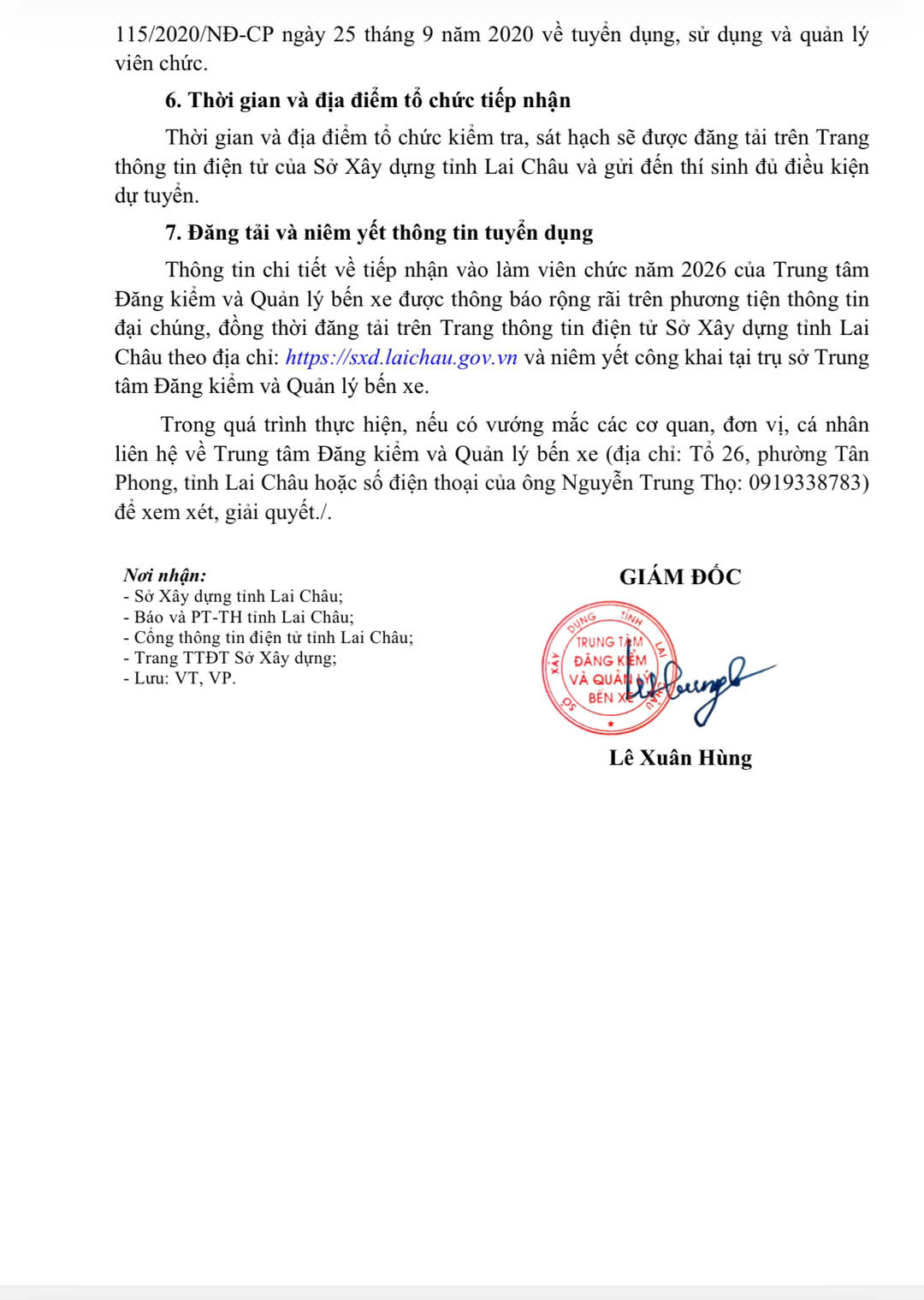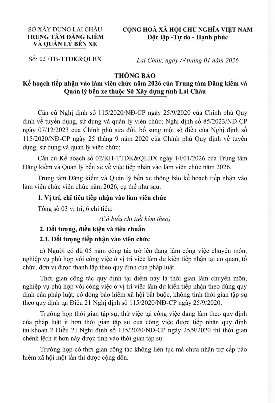 Trung tâm Đăng kiểm và Quản lý bến xe vừa ban hành thông báo Số: 02/TB-TTĐK&QLBX ngày 14/1/2026 Kế hoạch tiếp nhận vào làm viên chức năm 2026 của Trung tâm Đăng kiểm và Quản lý bến xe thuộc Sở Xây dựng tỉnh Lai Châu.