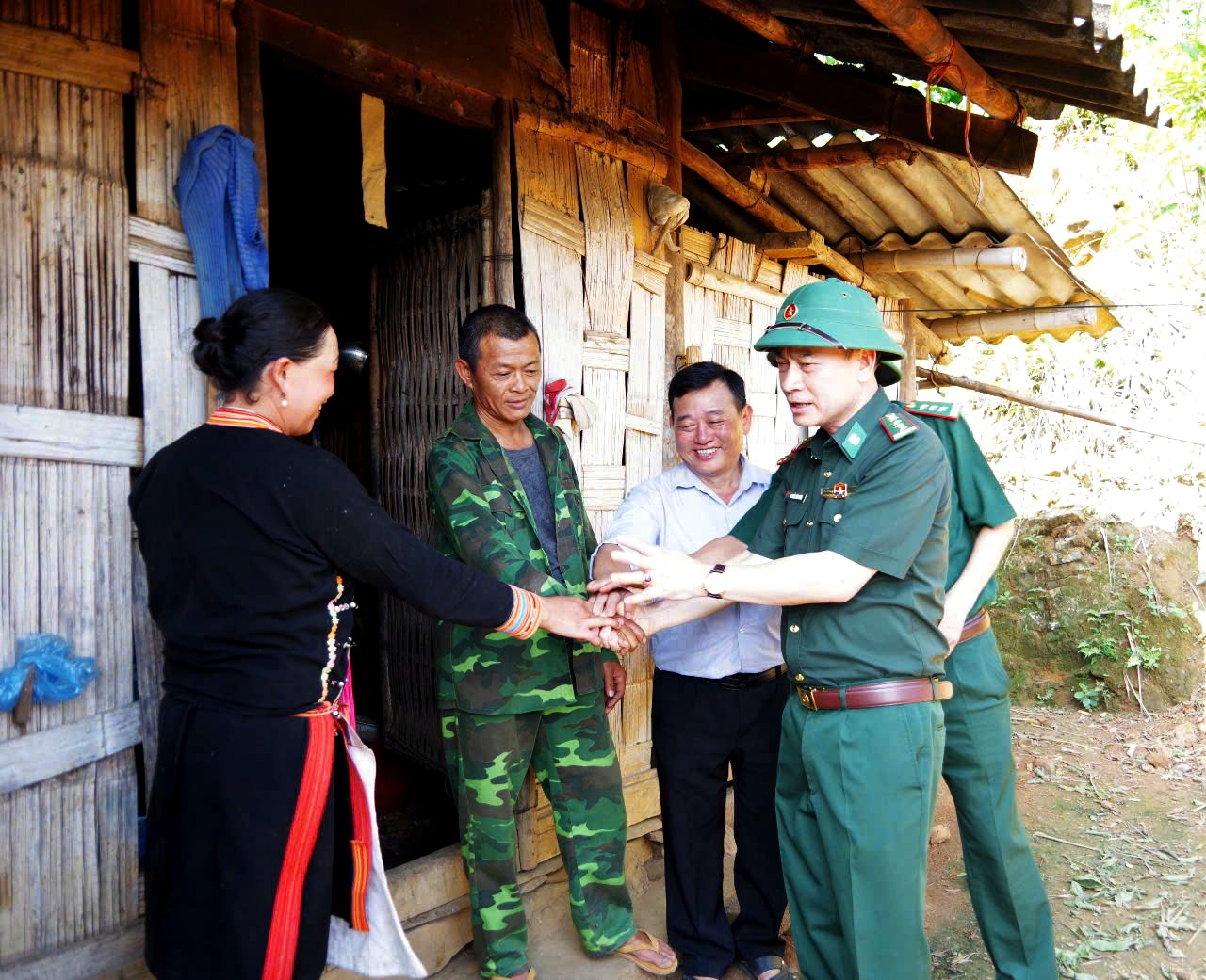 Đại tá Nguyễn Văn Hưng - Bí thư Đảng uỷ, Chính uỷ BĐBP tỉnh cùng các đồng chí trong đoàn công tác động viên các hộ nghèo cố gắng vượt qua khó khăn.