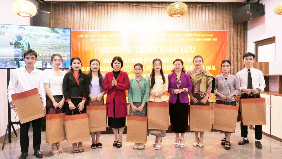 Lãnh đạo Sở Ngoại vụ, Trường Cao đẳng Lai Châu trao quà cho lưu học sinh Lào tại Chương trình giao lưu kỷ niệm Ngày thiết lập quan hệ ngoại giao Việt Nam - Lào.
