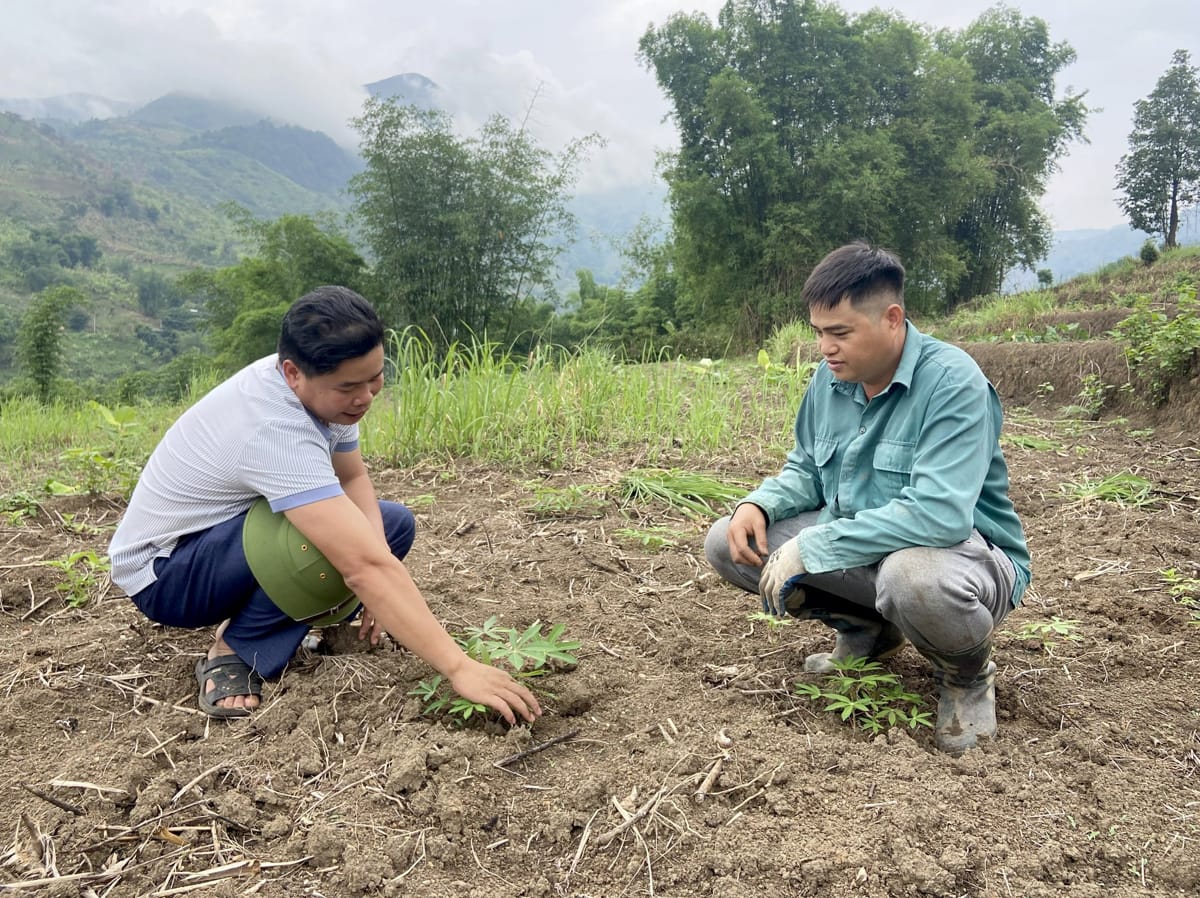Cán bộ xã Bản Lang (huyện Phong Thổ) hướng dẫn người dân chăm sóc sắn thời điểm khô hạn.