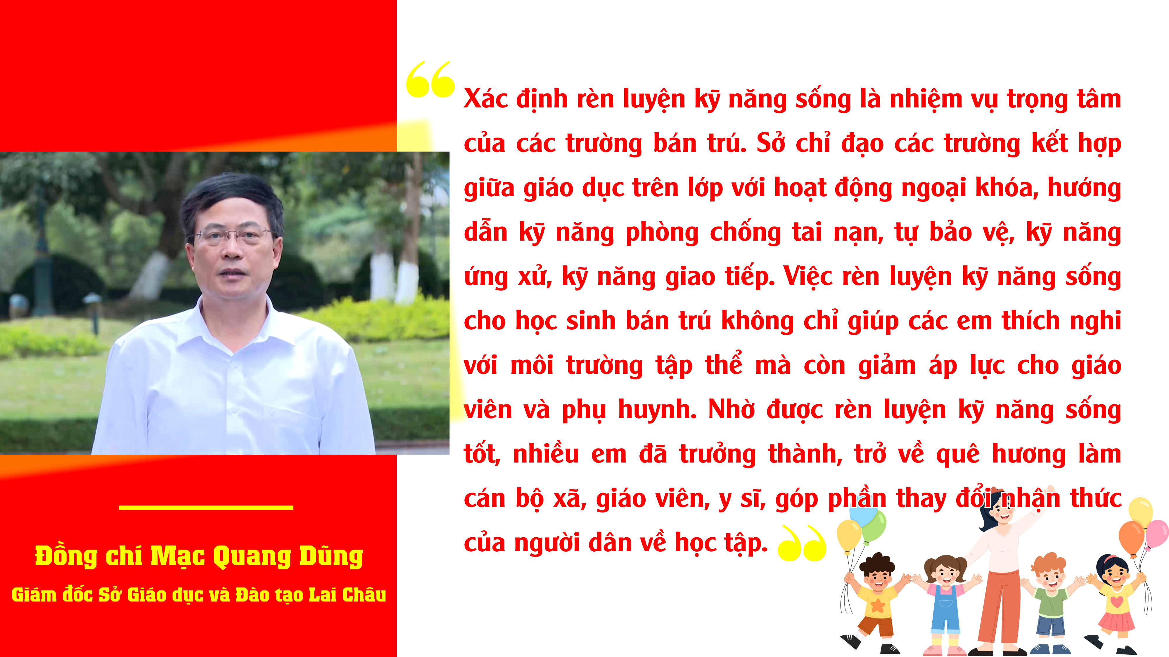 Giáo dục kỹ năng cho học sinh, xét đến cùng chính là trang bị cho thế hệ trẻ “chiếc chìa khóa mềm” để bước vào đời - đó là khả năng thích ứng, hợp tác, sáng tạo và tự chủ. Một học sinh có kỹ năng sống tốt sẽ biết tự bảo vệ mình, biết quan tâm người khác, biết sống có mục tiêu và khát vọng. Vì vậy, mỗi ngày trôi qua, ở ngôi trường bán trú - nơi được xem là ngôi nhà thứ 2 của học trò vùng cao, những bài học đầu tiên về nền nếp sinh hoạt, kỹ năng cuộc sống dần hình thành. Qua từng ngày, những đứa trẻ rụt rè, nhút nhát dần trở thành những cô bé, cậu bé mạnh dạn, tự tin biết quan tâm, biết giúp đỡ lẫn nhau. Và chính từ những bài học ấy, các em học sinh bán trú lớn lên từng ngày, tự tin viết tiếp giấc mơ vươn tới tri thức.