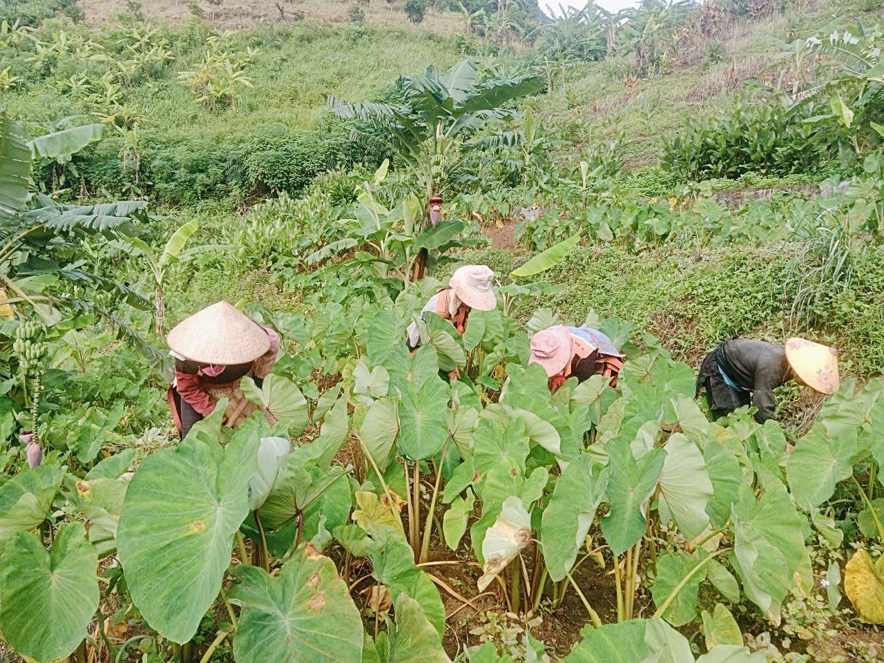 Người dân bản Dền Thàng thu hoạch khoai sọ.