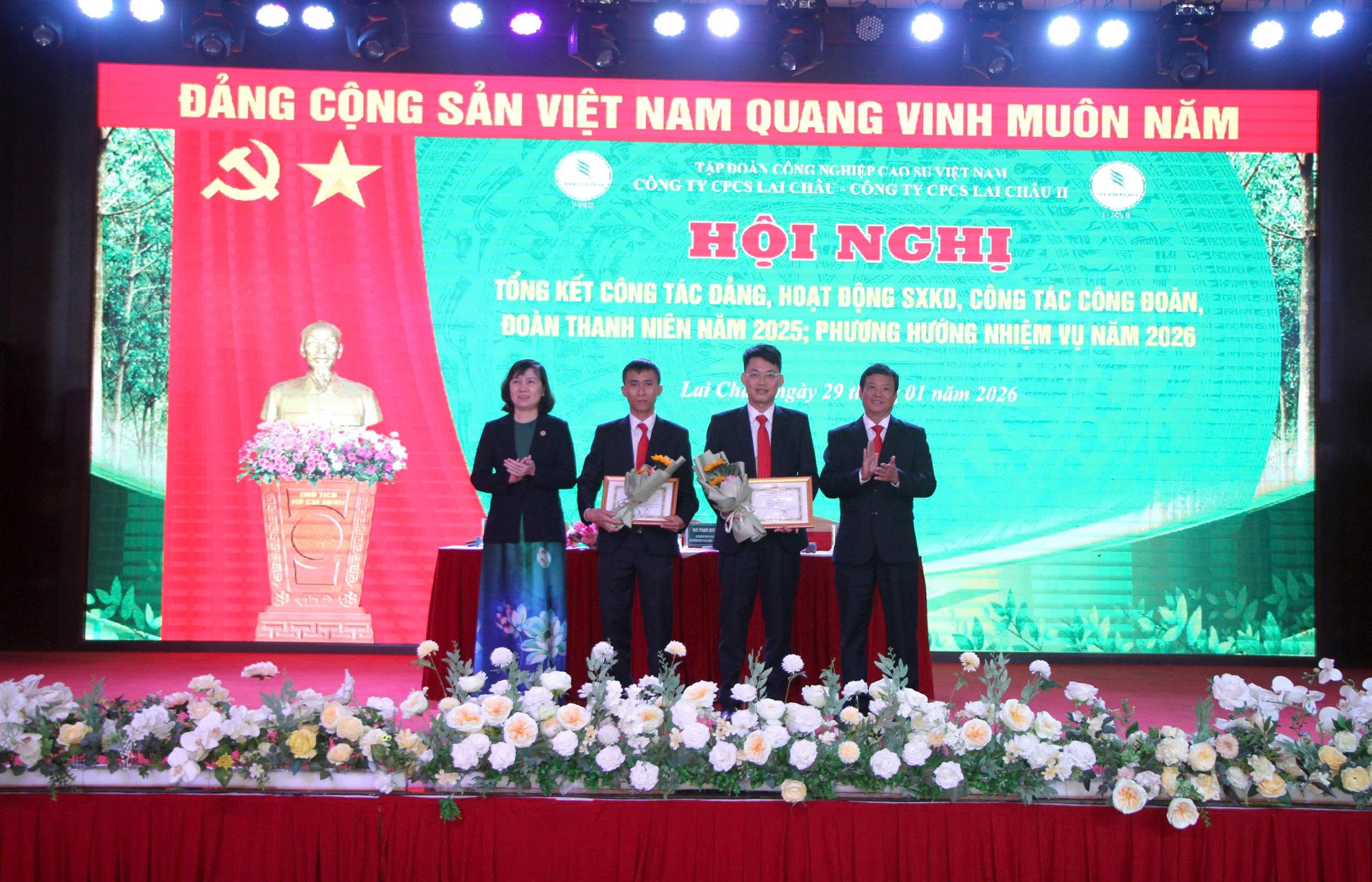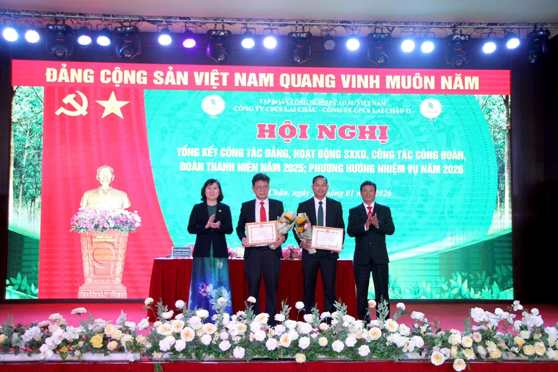Các đồng chí Huỳnh Thị Cẩm Hồng – Thành uỷ viên Thành phố Hồ Chí Minh, Thành viên Hội đồng quản trị, Chủ tịch Công đoàn Cao su Việt Nam; Phạm Duy Muôn – Bí thư Đảng uỷ, Chủ tịch Hội đồng Quản trị Công ty CPCS Lai Châu và Công ty CPCS Lai Châu II trao giấy khen cho các tập thể.