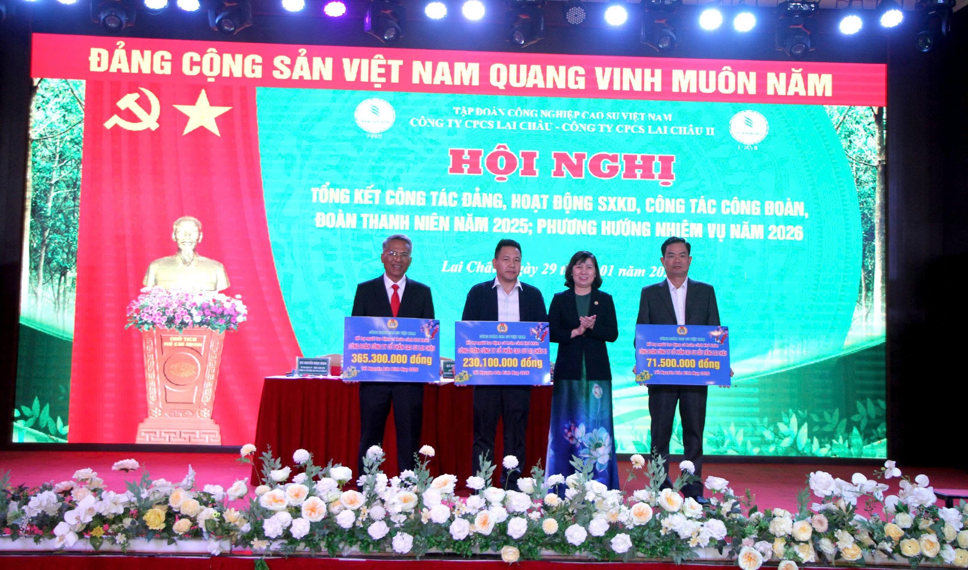 Nhân dịp này, Công đoàn Cao su Việt Nam hỗ trợ 513 suất quà cho đoàn viên, người lao động có hoàn cảnh khó khăn cho Công ty CPCS Lai Châu, Công ty CPCS Lai Châu II, Công ty CPCS Dầu Tiếng Lai Châu. Công ty CPCS Lai Châu và Công ty CPCS Lai Châu II Lai tặng giấy khen chó 4 tập thể, 108 cá nhân đã hoàn thành tốt nhiệm vụ trong sản xuất kinh doanh và công tác chuyên môn năm 2025.