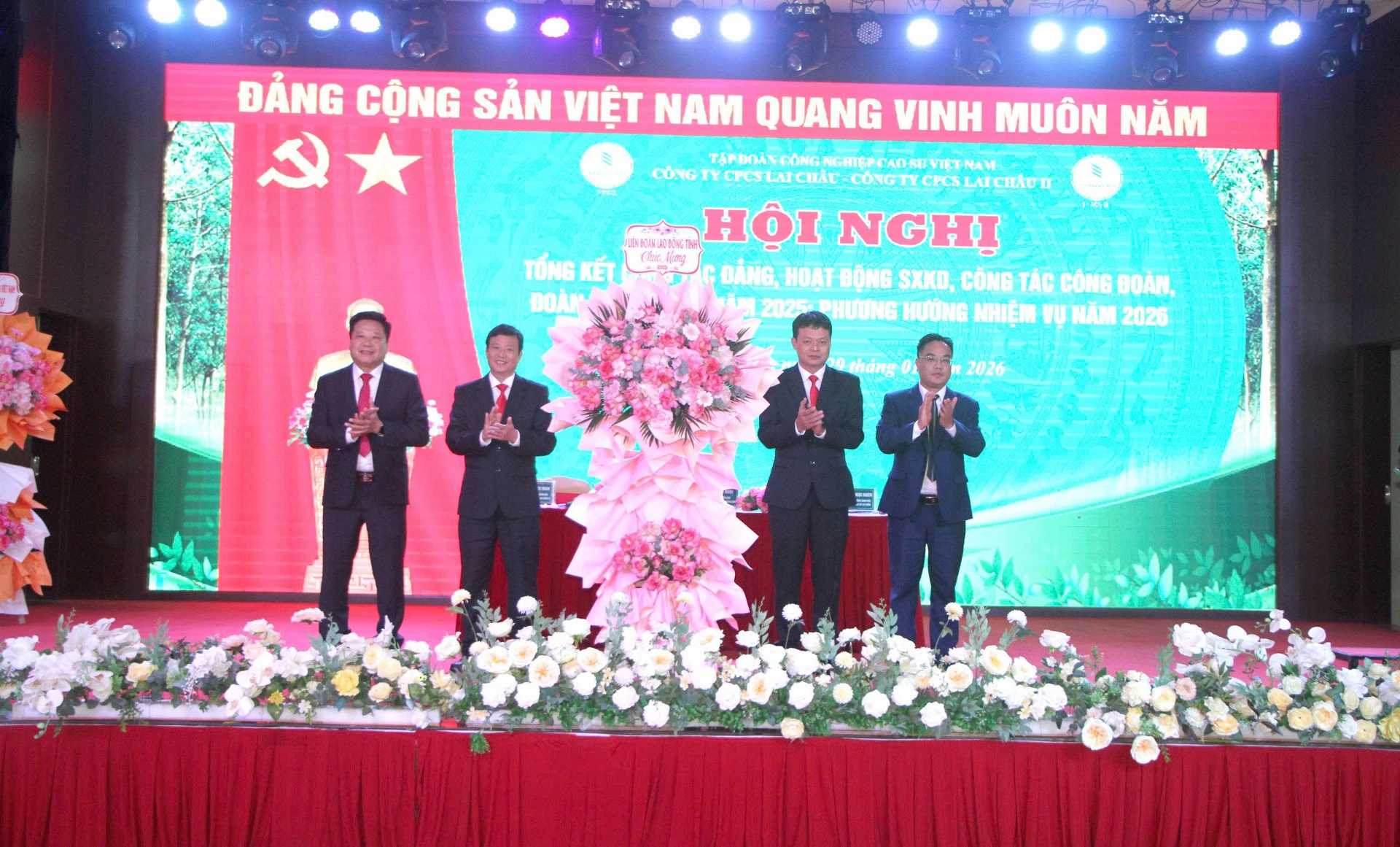 Về công tác Đảng, Đảng ủy 2 công ty lãnh đạo, chỉ đạo tổ chức Đại hội đảng các cấp được thực hiện nghiêm túc, đúng quy định; 100% chi bộ trực thuộc tổ chức thành công Đại hội nhiệm kỳ 2025–2030; đã kết nạp 4 đảng viên mới. Về sản xuất kinh doanh, Công ty CPCS Lai Châu đạt sản lượng 6.615,18/6.600 tấn, doanh thu 273 tỷ 230 triệu đồng, tiền 10% người dân góp đất năm 2025 chi năm 2026 là 25 tỷ 152 triệu đồng. Công ty CPCS Lai Châu II đạt sản lượng 1.968,26/3.500 tấn, doanh thu 128 tỷ 297 triệu đồng, tiền 10% người dân góp đất năm 2025 chi năm 2026 là 6.957 triệu đồng… Số cán bộ, nhân viên lao động: Cao su Lai Châu có 1.124 người, lương đạt 7,4 triệu đồng/tháng; Cao su Lai Châu II có 530 người, lương đạt 6,5 triệu đồng/tháng.