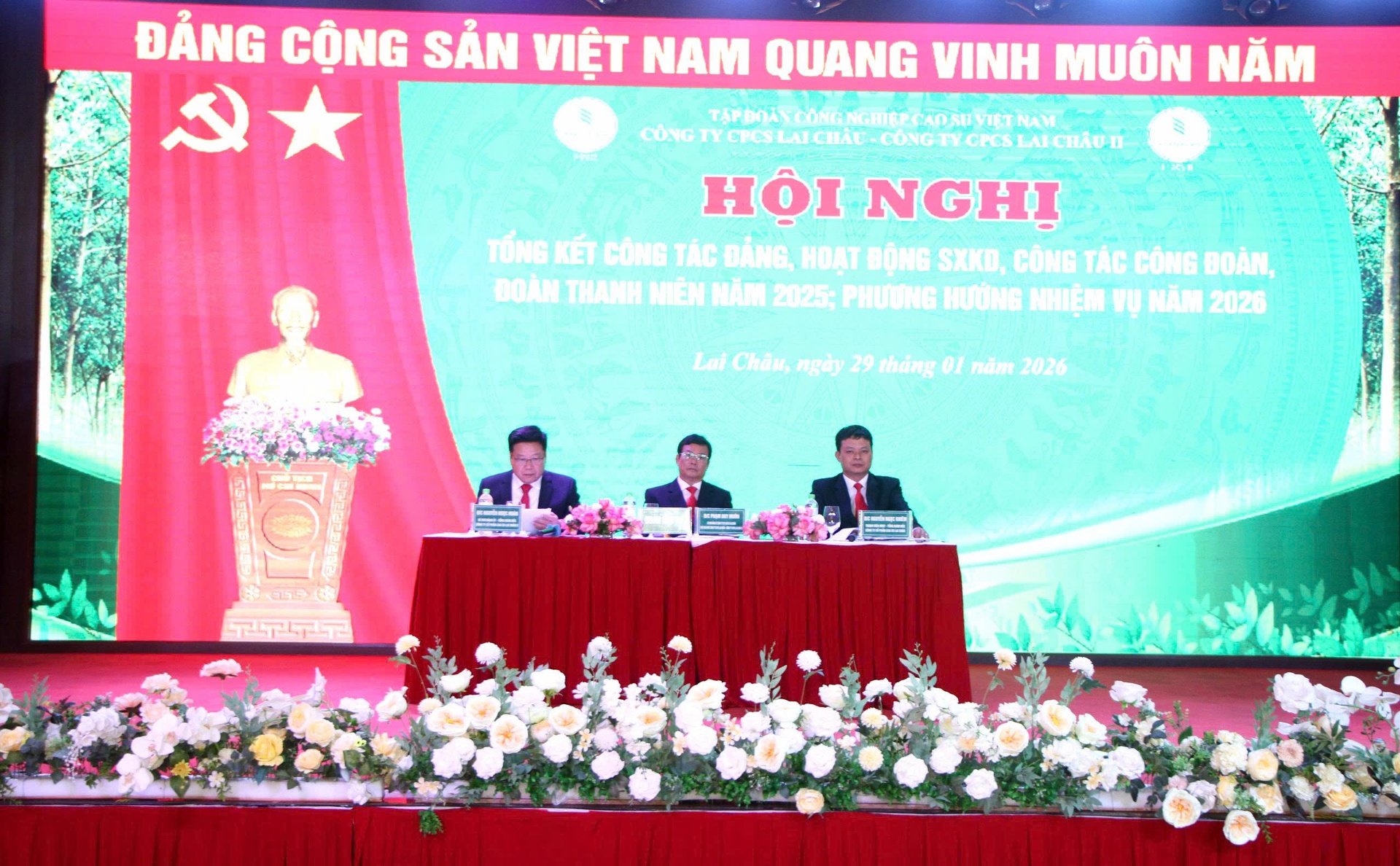 Sáng 29/1, Công ty Cổ phần Cao su (CPCS) Lai Châu và Công ty CPCS Lai Châu II tổ chức Hội nghị Tổng kết Công tác Đảng, hoạt động sản xuất kinh doanh, công tác Đoàn, Đoàn thanh niên năm 2025 và triển khai phương hướng, nhiệm vụ năm 2026.