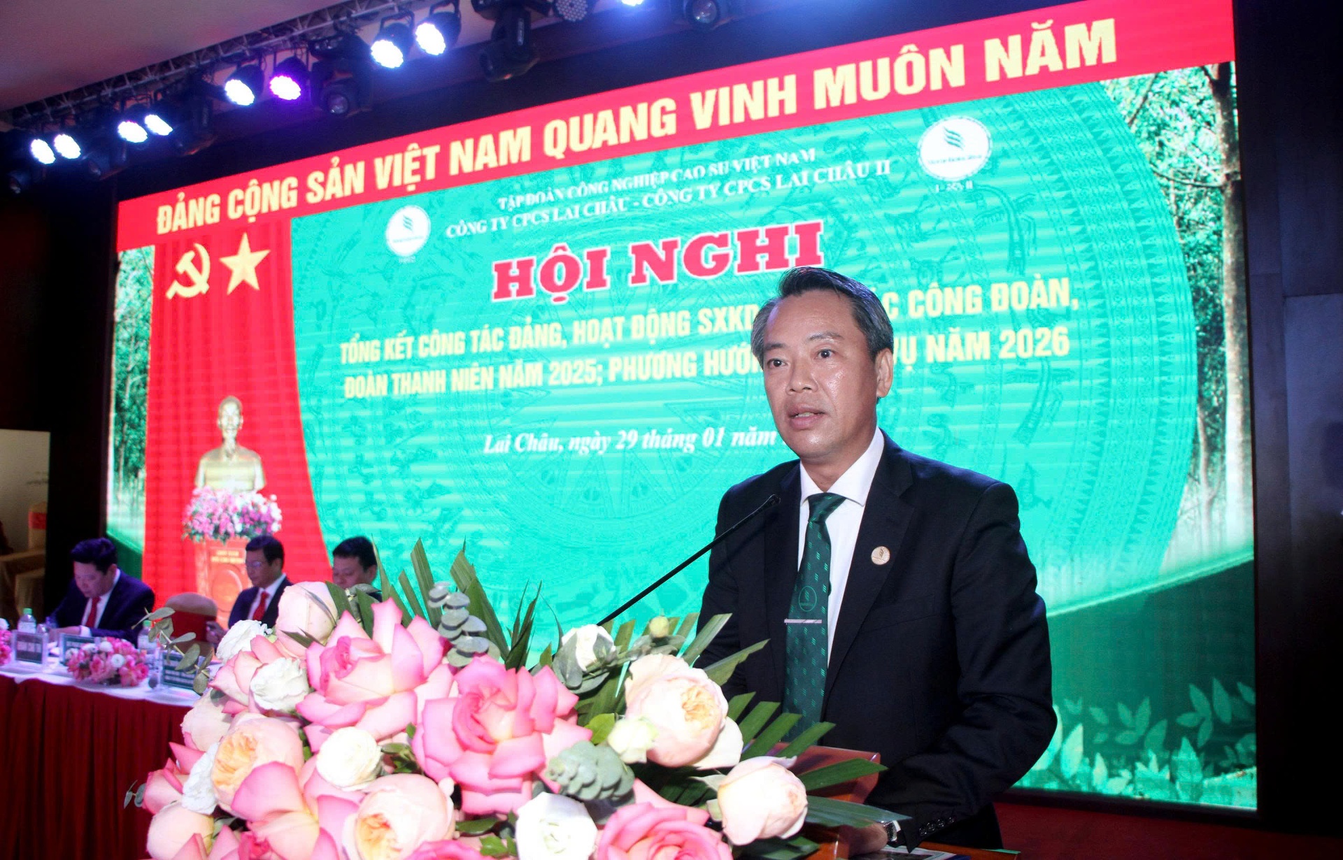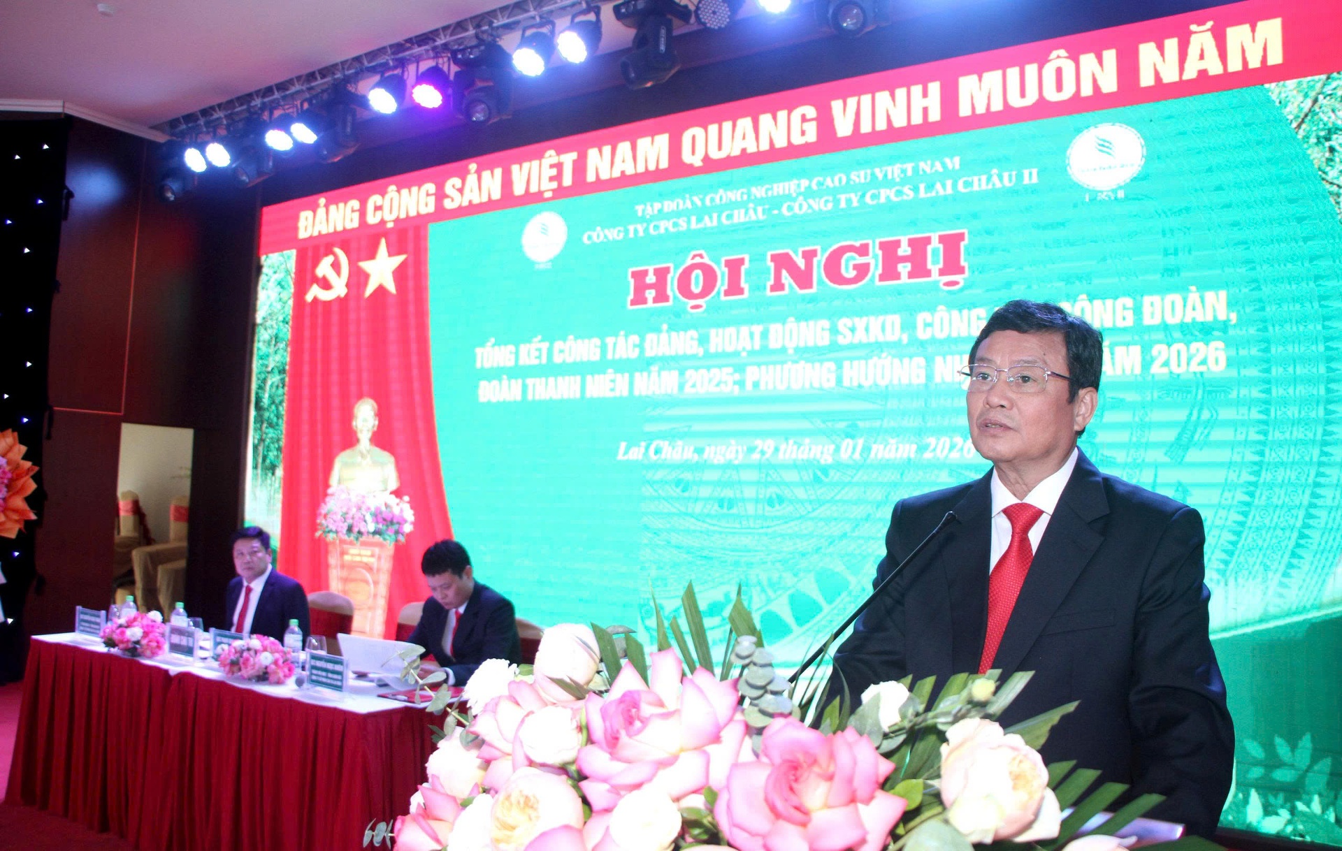 Phát biểu tại hội nghị, các đồng chí Phạm Văn Hỏi Em – Phó Tổng Giám đốc Tập đoàn Công nghiệp Cao su Việt Nam; Phạm Duy Muôn – Bí thư Đảng uỷ, Chủ tịch Hội đồng Quản trị Công ty CPCS Lai Châu và Công ty CPCS Lai Châu II biểu dương, ghi nhận những kết quả đạt được của hai Công ty trong hoạt động sản xuất kinh doanh năm 2025. Đồng thời đề nghị, trong thời gian tơi hai Công ty cấn có các giải pháp khắc phục những tồn tại, hạn chế trong năm 2025; căn cứ các chỉ tiêu kế hoạch Tập Đoàn giao sớm triển khai các nhiệm vụ, mục tiêu ngay từ những ngày đầu năm 2026 phấn đấu hoàn thành và vượt các chỉ tiêu về sản lượng, doanh thu, lợi nhuận; tập trung nâng cao chất lượng vườn cây, đảm bảo đầy đủ vật tư trang bị, có chính sách thu hút đảm bảo đủ lao động cạo mủ; phát huy hiệu quả nhà máy chế biến nâng cao chất lượng sản phẩm; thực hiện nghiêm việc chi trả 10% giá trị sản phẩm theo hợp đồng góp đất bảo đảm đúng đối tượng, kịp thời, công khai, minh bạch; làm tốt công tác chăm lo, bảo vệ quyền, lợi ích hợp pháp chính đáng của đoàn viên, người lao động; tổ chức các lớp tập huấn nâng cao tay nghề cho các lao động, tích cực ứng dụng công nghệ, chuyển đổi số trong công tác quản lý.