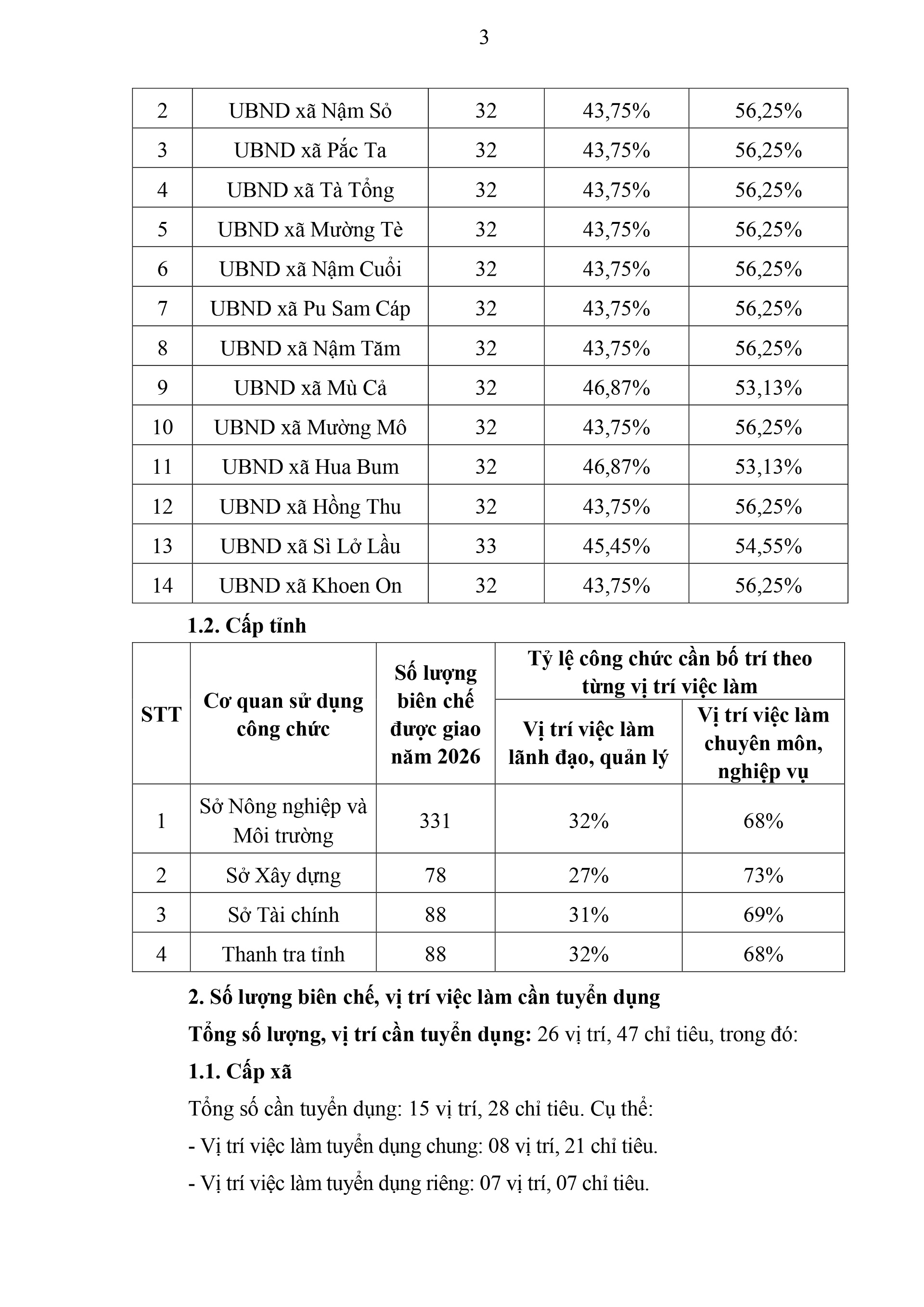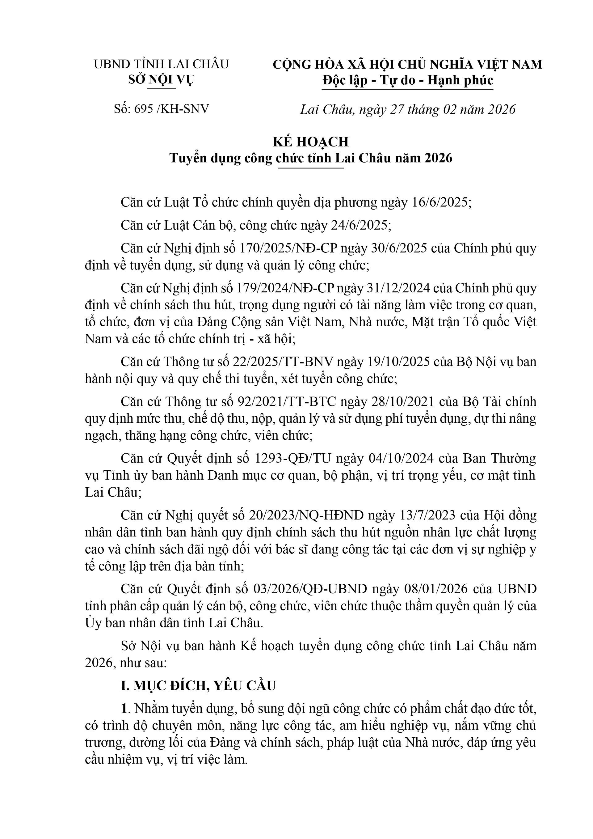 Sở Nội vụ vừa ban hành kế hoạch Số: 695/ KH-SNV ngày 27/2/2026 về Kế hoạch tuyển dụng công chức tỉnh Lai Châu năm 2026.