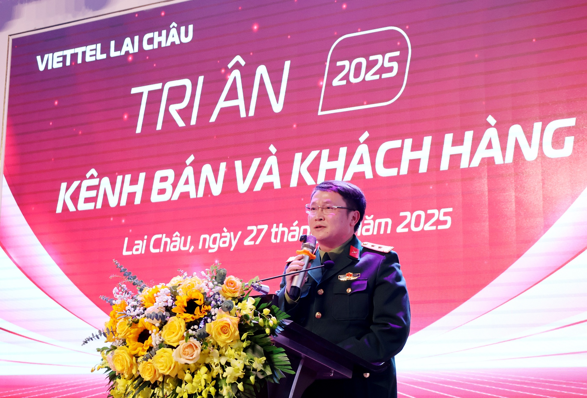 Trung tá Nguyễn Ngọc Nguyên - Giám đốc Viettel Lai Châu phát biểu tri ân kênh bán và khách hàng.