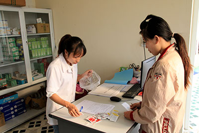 Cán bộ Trạm Y tế xã Nậm Hàng cấp phát thuốc cho người dân.
