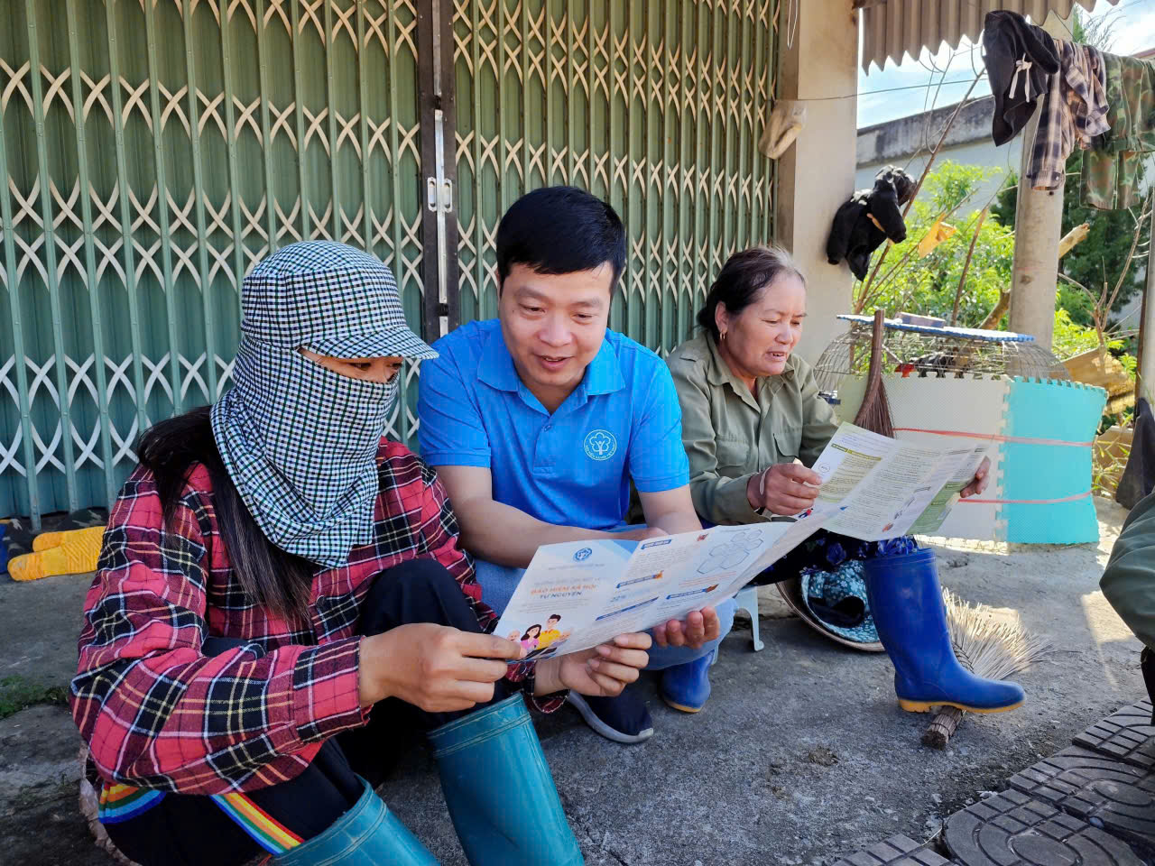 Cán bộ Bảo hiểm xã hội tỉnh (thứ 2 từ trái sang) tuyên truyền chính sách bảo hiểm xã hội tự nguyện đến người dân.