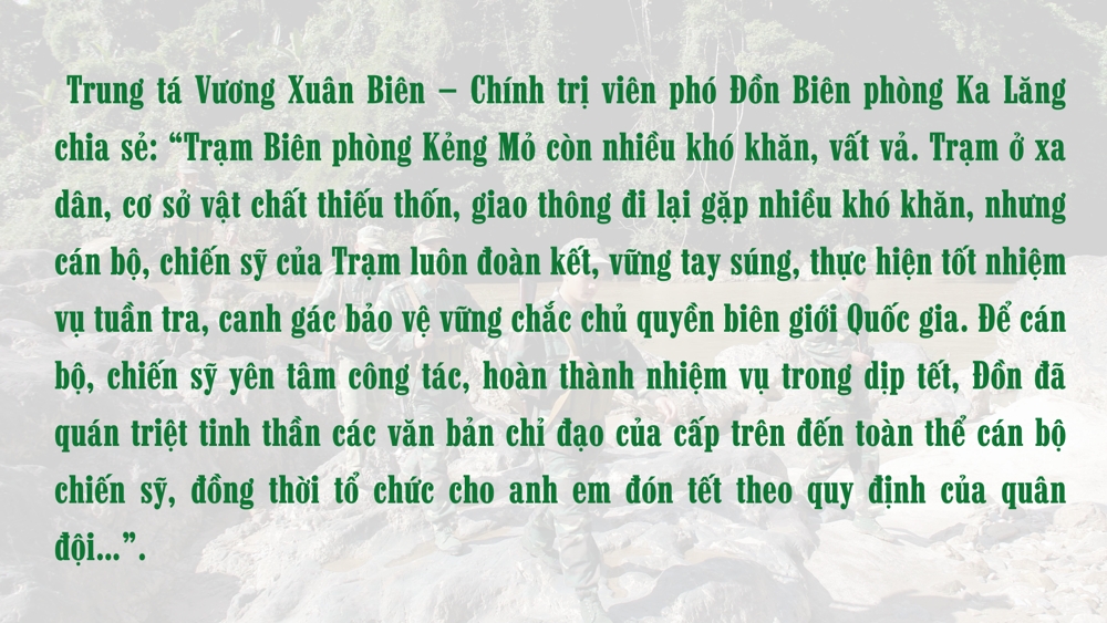 Chương trình “Xuân Biên phòng ấm lòng dân bản” khép lại cũng là lúc chúng tôi bắt đầu một hành trình thật sự ý nghĩa cùng bà con dân bản đến thăm, chúc tết cán bộ, chiến sỹ Trạm Biên phòng Kẻng Mỏ. Cuộc hành trình đến với Kẻng Mỏ mất hơn 1 giờ đồng hồ bởi tuyến đường đang được UBND huyện đầu tư nâng cấp. Những cơn mưa xuân như chất xúc tác trộn lên con đường một lớp bùn lầy, khiến việc di chuyển của chúng tôi khó khăn hơn. Ở nơi thượng nguồn, dòng sông Đà như được thu nhỏ lại với những thác nước chảy xiết tung bọt trắng xóa, hai bên bờ là những cánh rừng rậm nguyên sinh với một màu xanh đầy sức sống, tạo nên khung cảnh núi non hùng vĩ. Trạm Biên phòng Kẻng Mỏ hiện ra với một khu nhà gỗ “Đậm màu thời gian” nằm bên bìa rừng.