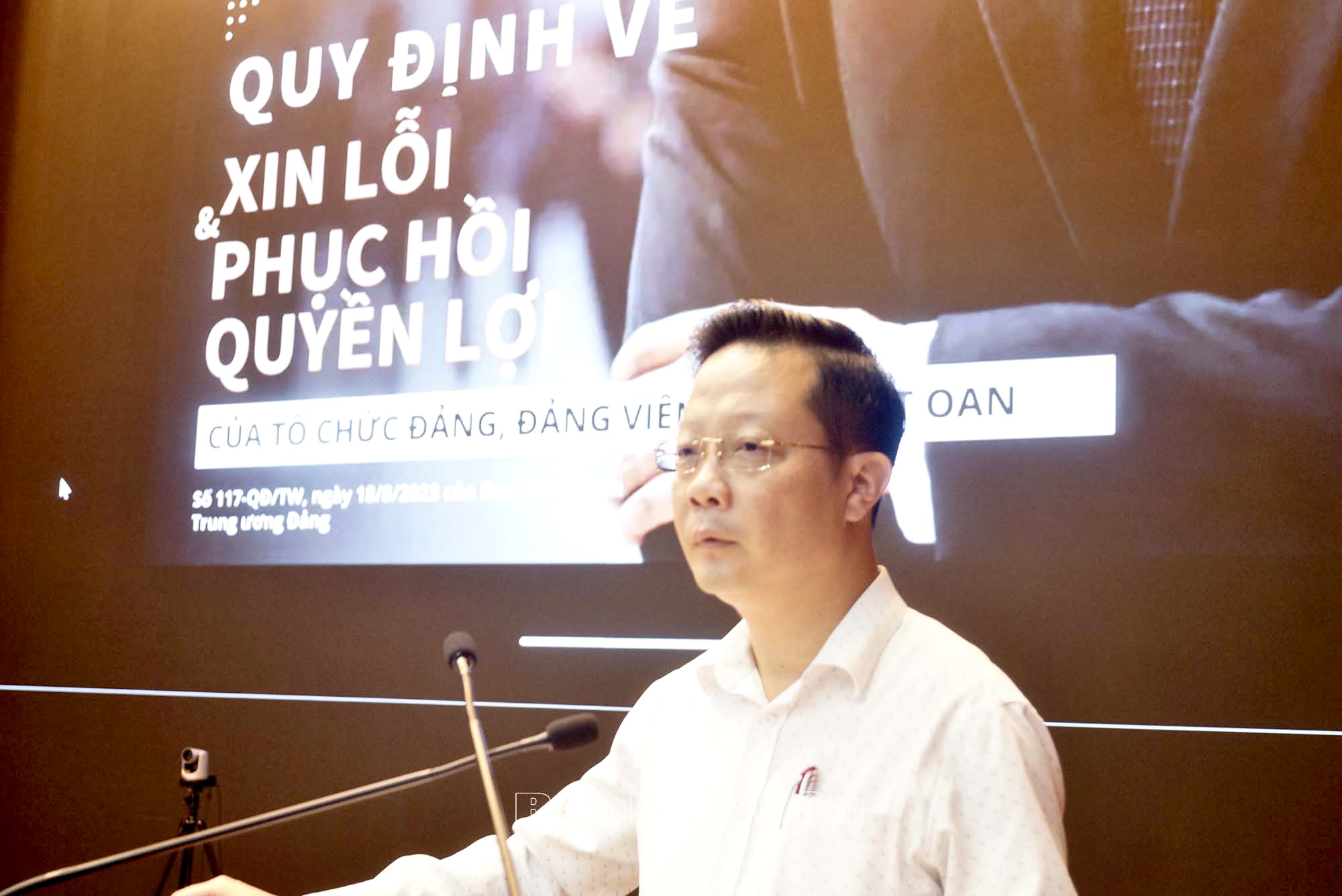 Đồng chí Nguyễn Ngọc Vinh - Ủy viên Ban Thường vụ, Chủ nhiệm Uỷ ban Kiểm tra Tỉnh ủy quán triệt Quy định số 117-QĐ/TW tại hội nghị.