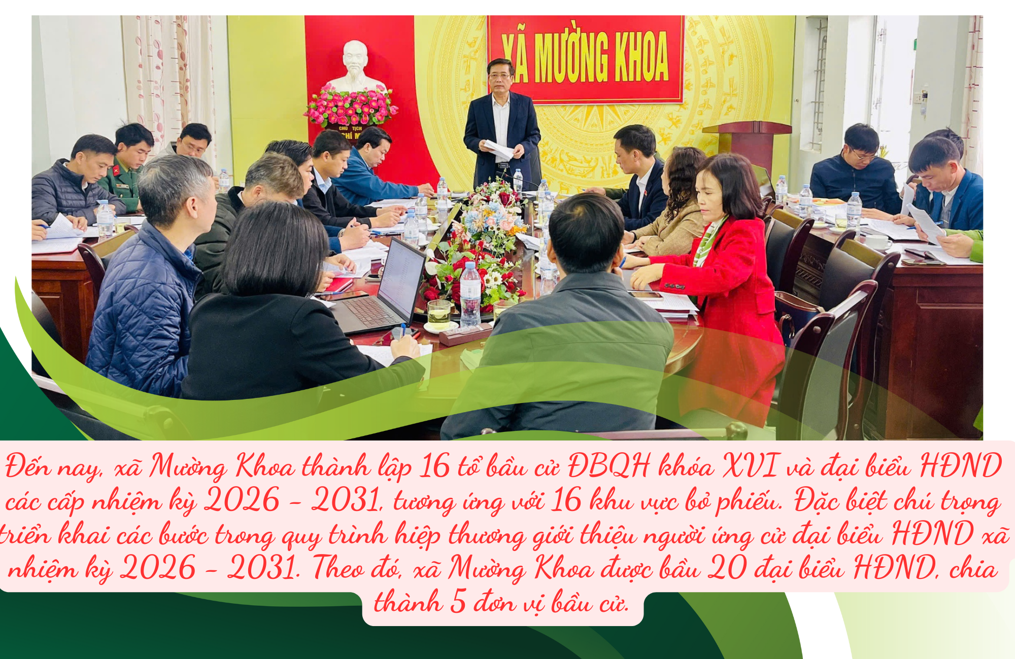 Xã Mường Khoa 2.649 hộ, 12.606 nhân khẩu sinh sống tại 15 bản. Ngay sau khi có các văn bản chỉ đạo, hướng dẫn của Trung ương, tỉnh, xã thành lập Ủy ban Bầu cử đúng thời gian, thành phần theo quy định. Trên cơ sở đó, Ủy ban Bầu cử xã xây dựng kế hoạch tổng thể, phân công nhiệm vụ cụ thể cho từng thành viên, bảo đảm rõ người, rõ việc, rõ trách nhiệm.Đến nay, xã cũng đã thành lập 16 tổ bầu cử ĐBQH khóa XVI và đại biểu HĐND các cấp nhiệm kỳ 2026 - 2031, tương ứng với 16 khu vực bỏ phiếu trên địa bàn. Đặc biệt chú trọng triển khai các bước trong quy trình hiệp thương giới thiệu người ứng cử đại biểu HĐND xã nhiệm kỳ 2026 - 2031. Theo đó, xã Mường Khoa được bầu 20 đại biểu HĐND, chia thành 5 đơn vị bầu cử. Hội nghị hiệp thương lần thứ nhất đã được tổ chức đúng thời gian, đúng thành phần, thống nhất cao về cơ cấu, số lượng và thành phần người được giới thiệu ứng cử.