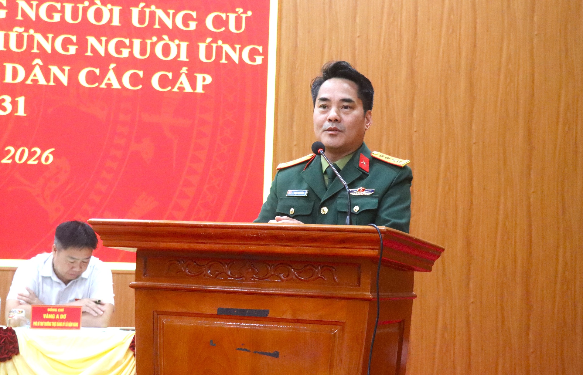Đại tá Triệu Kim Thắng - Chính ủy Bộ Chỉ huy Quân sự tỉnh trình bày chương trình hành động khi được bầu làm đại biểu Quốc hội khóa XVI.