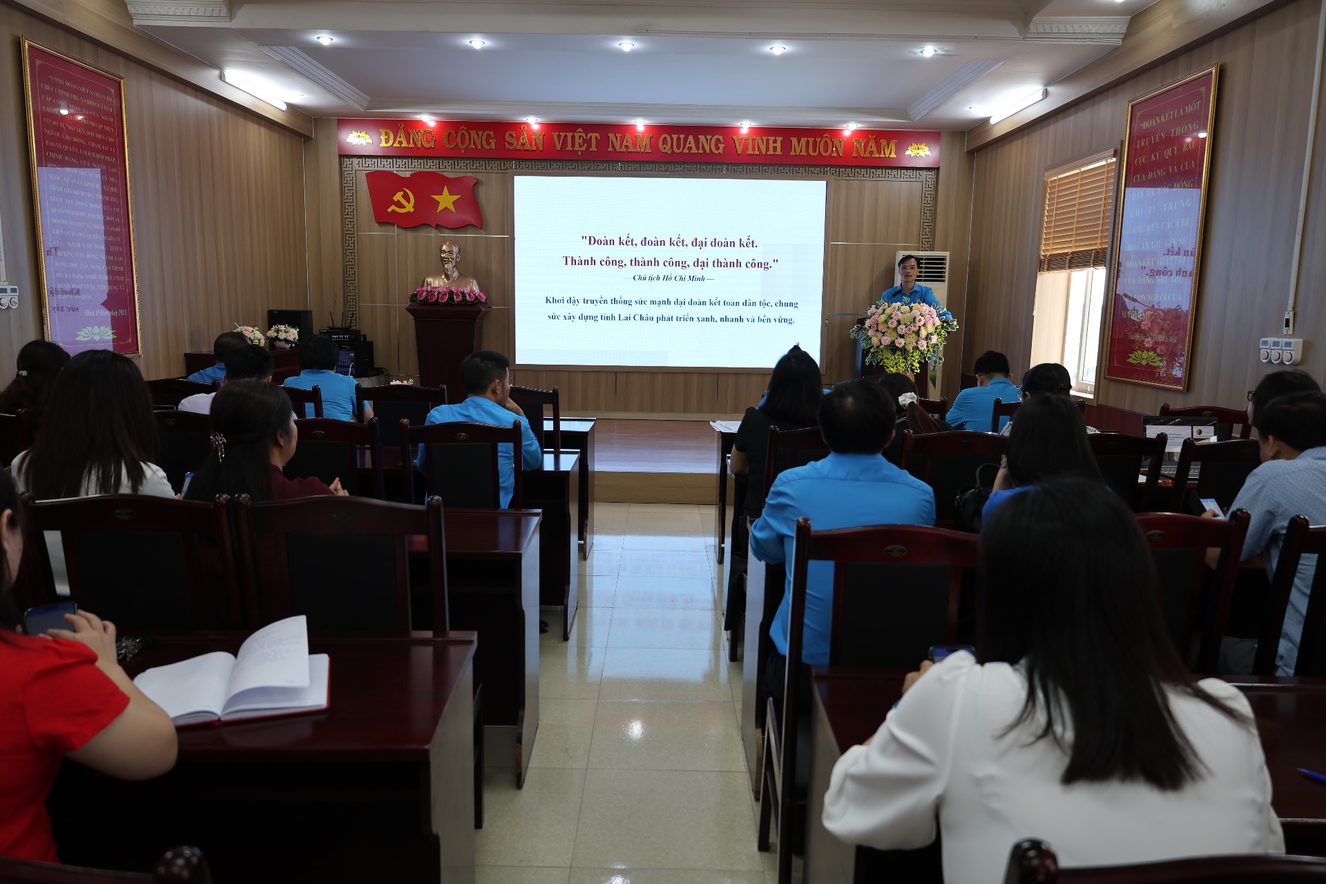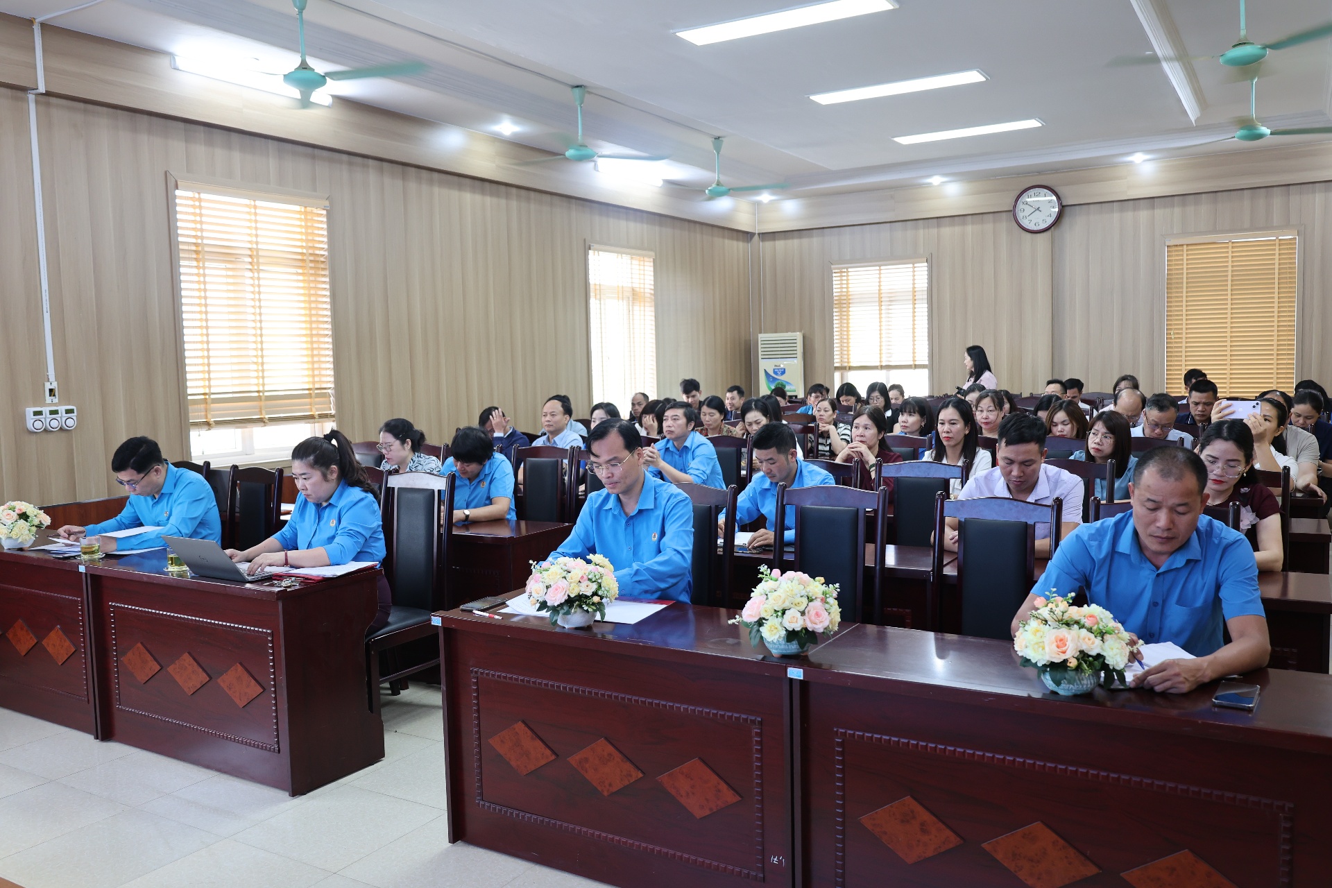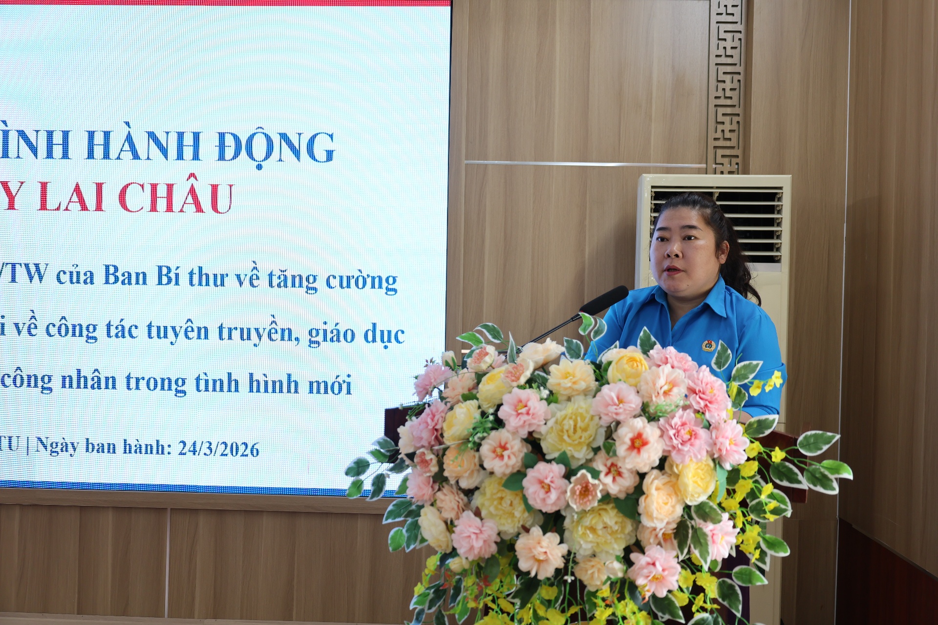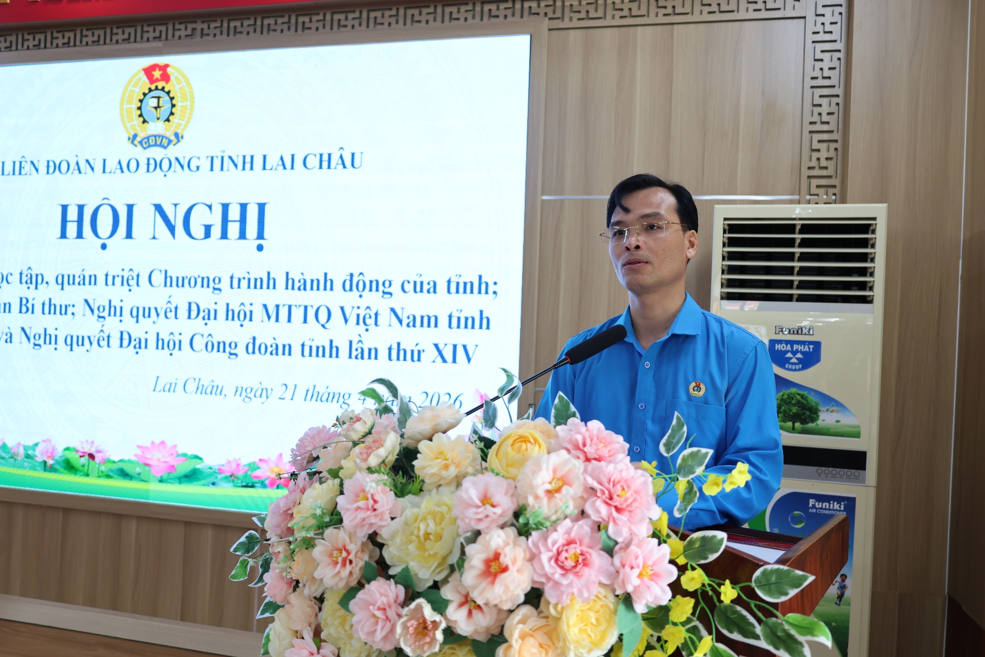 Tại hội nghị, hơn 50 đại biểu là chủ tịch, phó chủ tịch các công đoàn cơ sở... được nghe các đồng chí lãnh đạo LĐLĐ tỉnh quán triệt, triển khai nhiều nội dung quan trọng, trọng tâm là Chương trình số 15-CTr/TU, ngày 04/3/2026 của Ban Chấp hành Đảng bộ tỉnh về thực hiện Nghị quyết Đại hội Đại biểu Toàn quốc lần thứ XIV của Đảng; Chương trình số 18-CTr/TU, ngày 24/3/2026 của Tỉnh ủy Lai Châu về thực hiện Chỉ thị số 58-CT/TW của Ban Bí thư liên quan đến tăng cường sự lãnh đạo của Đảng đối với công tác tuyên truyền, giáo dục chính trị, tư tưởng, pháp luật cho công nhân trong tình hình mới.