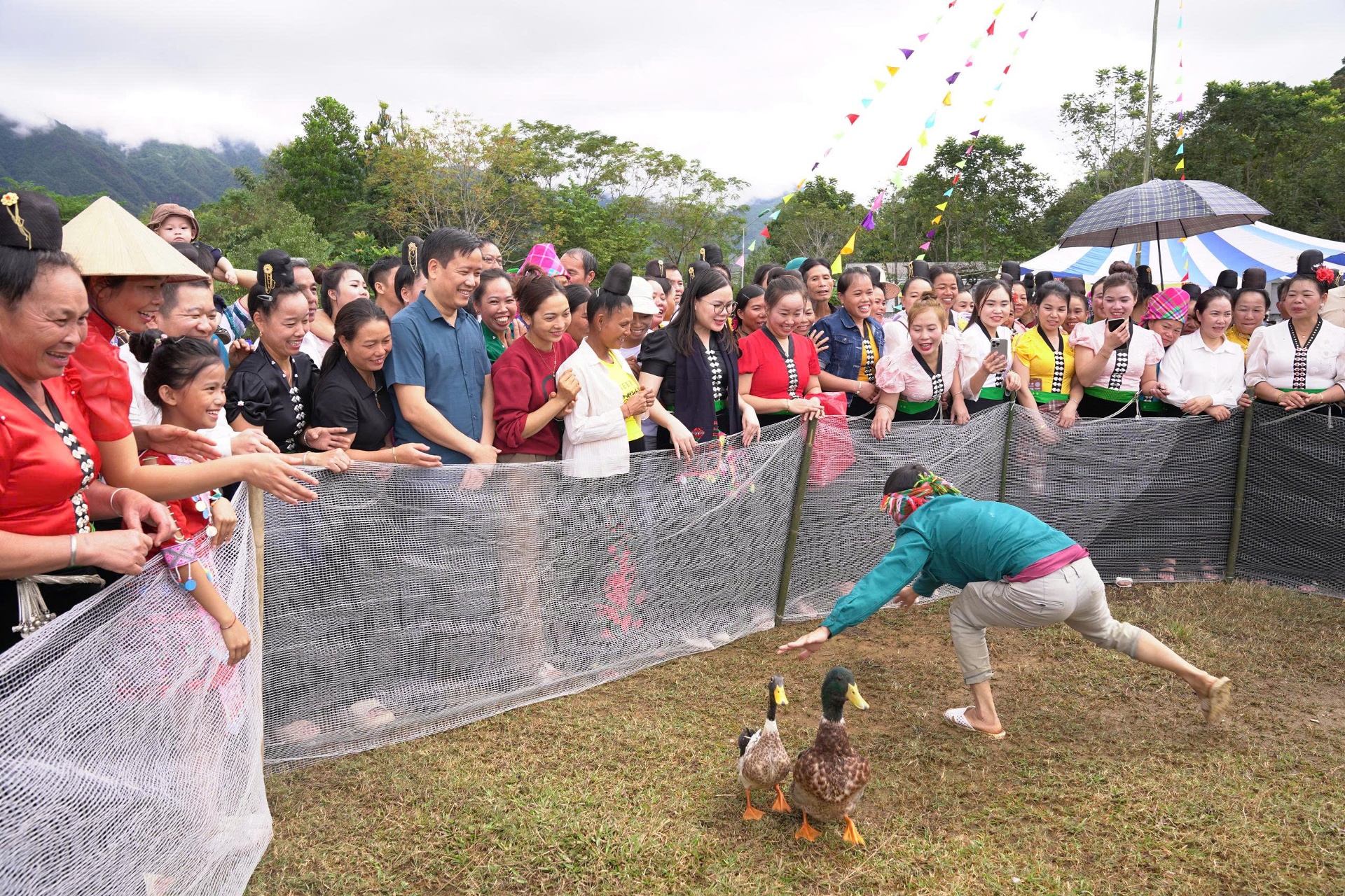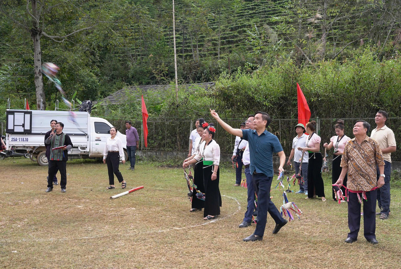 Đồng chí Lê Đức Dục - Ủy viên Ban Thường vụ Tỉnh ủy, Trưởng Ban Tuyên giáo và Dân vận Tỉnh ủy tham gia trò chơi ném còn cùng bà con dân bản.