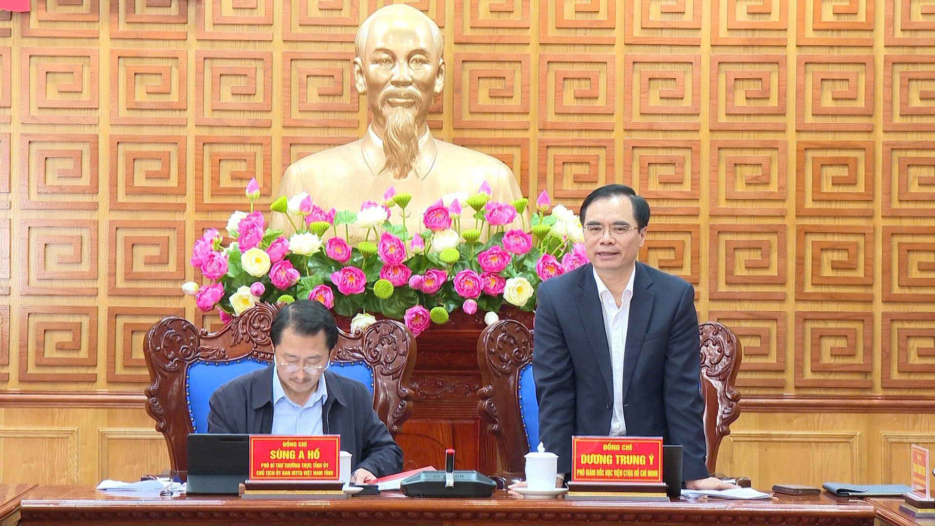 Các đồng chí: Sùng A Hồ - Phó Bí thư Thường trực Tỉnh ủy, Chủ tịch Ủy ban MTTQ Việt Nam tỉnh; PGS.TS Dương Trung Ý - Phó Giám đốc Học viện Chính trị quốc gia Hồ Chí Minh đồng chủ trì buổi làm việc.