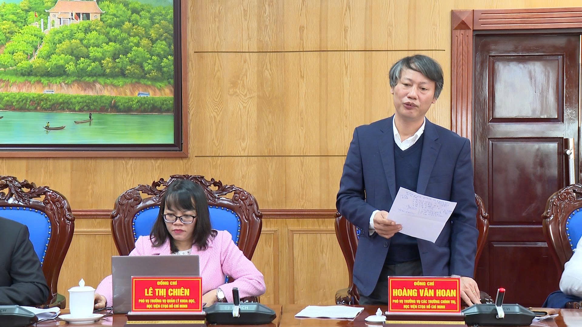 Phát biểu tại buổi làm việc, PGS.TS Dương Trung Ý - Phó Giám đốc Học viện đánh giá cao sự quan tâm của Ban Thường vụ Tỉnh ủy đối với công tác đào tạo, bồi dưỡng cán bộ trong thời gian qua. Đối với Trường Chính trị tỉnh, đồng chí Phó Giám đốc Học viện đề nghị, trường cần đẩy nhanh tiến độ xây dựng Trường Chính trị chuẩn, phấn đấu đạt chuẩn mức 1 trong năm 2026, chuẩn mức 2 trước năm 2032. Nhà trường cần có quy hoạch tổng thể về cơ sở vật chất trường, có chiến lược dài hạn để đạt chuẩn bền vững; các đề tài nghiên cứu khoa học của trường cần bám sát vào chương trình hành động của địa phương; đồng thời, cần có kế hoạch đào tạo, bồi dưỡng cán bộ cho cả nhiệm kỳ. Với trách nhiệm của mình, Học viện sẽ hỗ trợ tỉnh để đào tạo nguồn cán bộ cũng như hỗ trợ về mặt chuyên môn để giảng viên của Trường Chính trị đạt chuẩn.