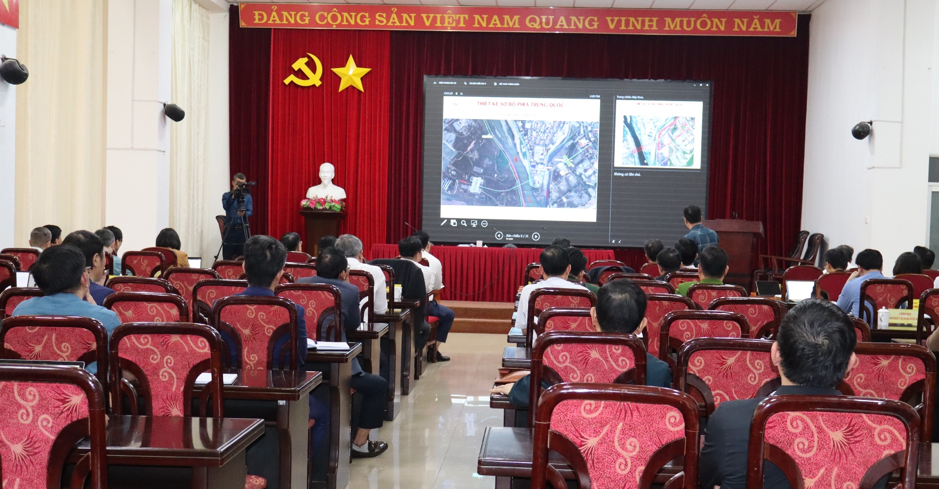 Đại diện Sở Xây dựng báo cáo phương án thiết kế sơ bộ công trình cầu đường bộ đa công năng qua biên giới cửa khẩu Ma Lù Thàng (Việt Nam) - Kim Thủy Hà (Trung Quốc).