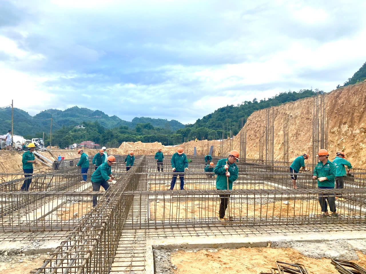 Công nhân Công ty TNHH Thương mại và Xây dựng số 6 Điện Biên thi công hạng mục nhà bán trú tiểu học thuộc dự án xây dựng Trường Phổ thông Dân tộc nội trú liên cấp Tiểu học và Trung học cơ sở Phong Thổ