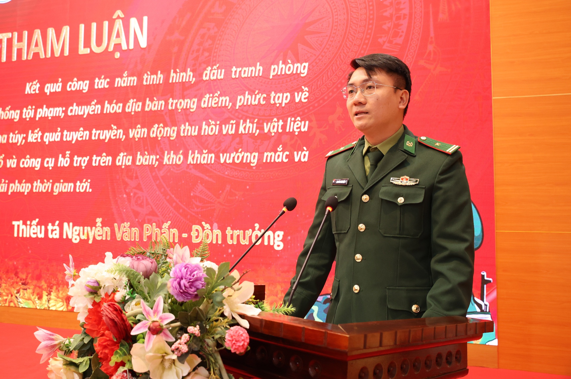 Tham luận tại hội nghị, các đại biểu tập trung thảo luận, làm rõ một số nội dung về: công tác đấu tranh, phòng chống tội phạm trên khu vực biên giới; tuyên truyền, vận động nhân dân thu hồi vũ khí vật liệu nổ; thực hiện Chuyển đổi số và phong trào “Bình dân học vụ số”; xây dựng đơn vị vững mạnh toàn diện “mẫu mực, tiêu biểu”…