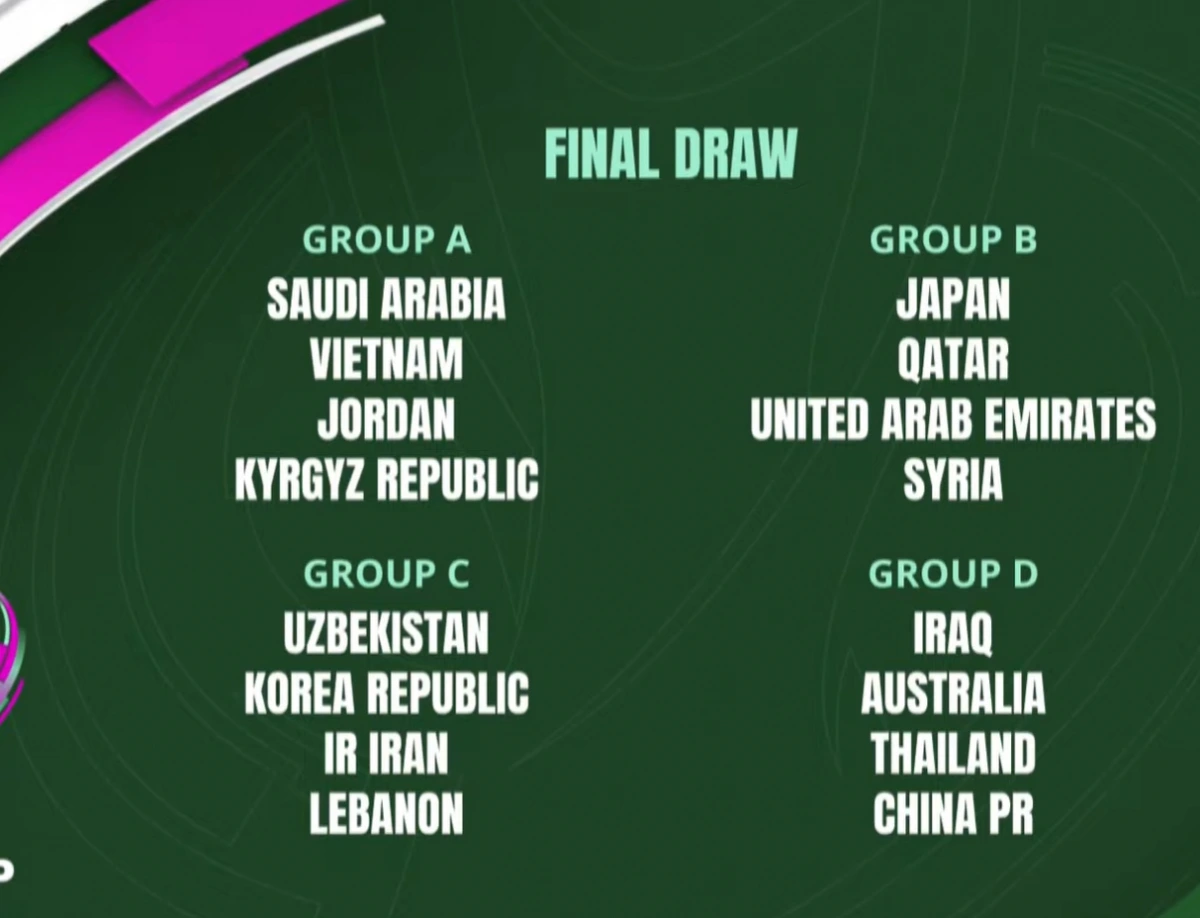 Bảng B có Qatar, UAE, Syria, Nhật Bản. Bảng C có Hàn Quốc, Iran, Lebanon, Uzbekistan. Bảng D có Thái Lan, Trung Quốc, Australia, Iraq.