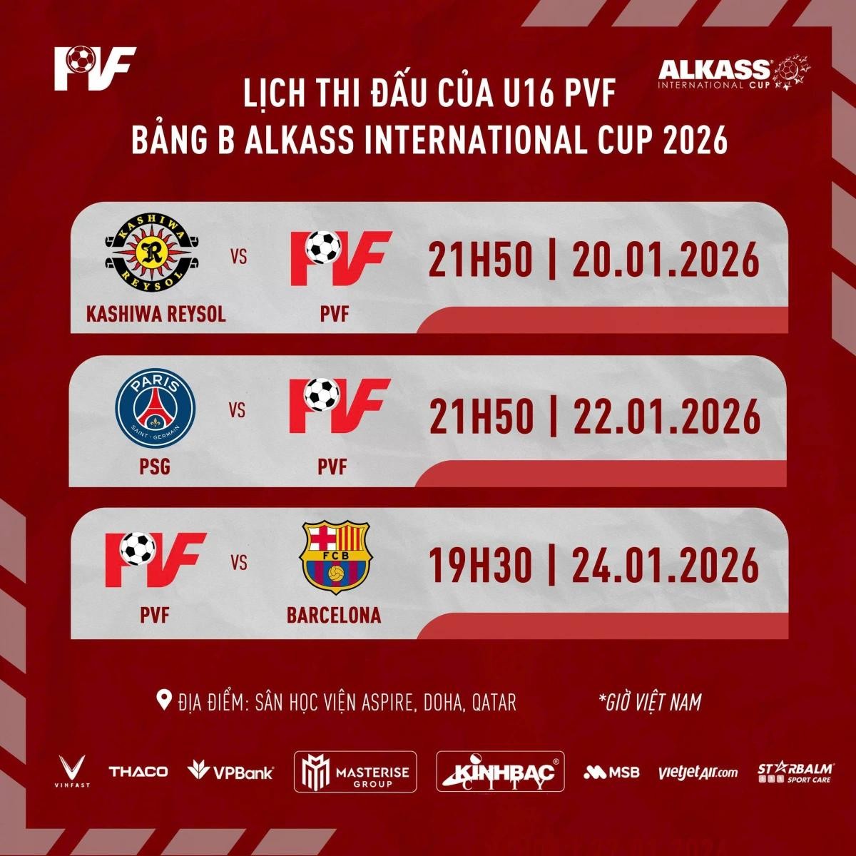 U16 PVF thi đấu trận ra quân tại Alkass International Cup 2026 gặp U16 Kashiwa Reysol (Nhật Bản) lúc 21h50 ngày 20/1/2026. Đối thủ tiếp theo của đại diện tới từ Việt Nam là U16 PSG (Pháp). Trận đấu diễn ra lúc 21h50 ngày 22/1. Ở trận đấu cuối cùng của vòng bảng, U16 PVF đụng độ U16 Barcelona lúc 19h30 ngày 24/1. Tất cả các trận đấu đều diễn ra tại sân bóng số 7 học viện Aspire, Doha, Qatar.