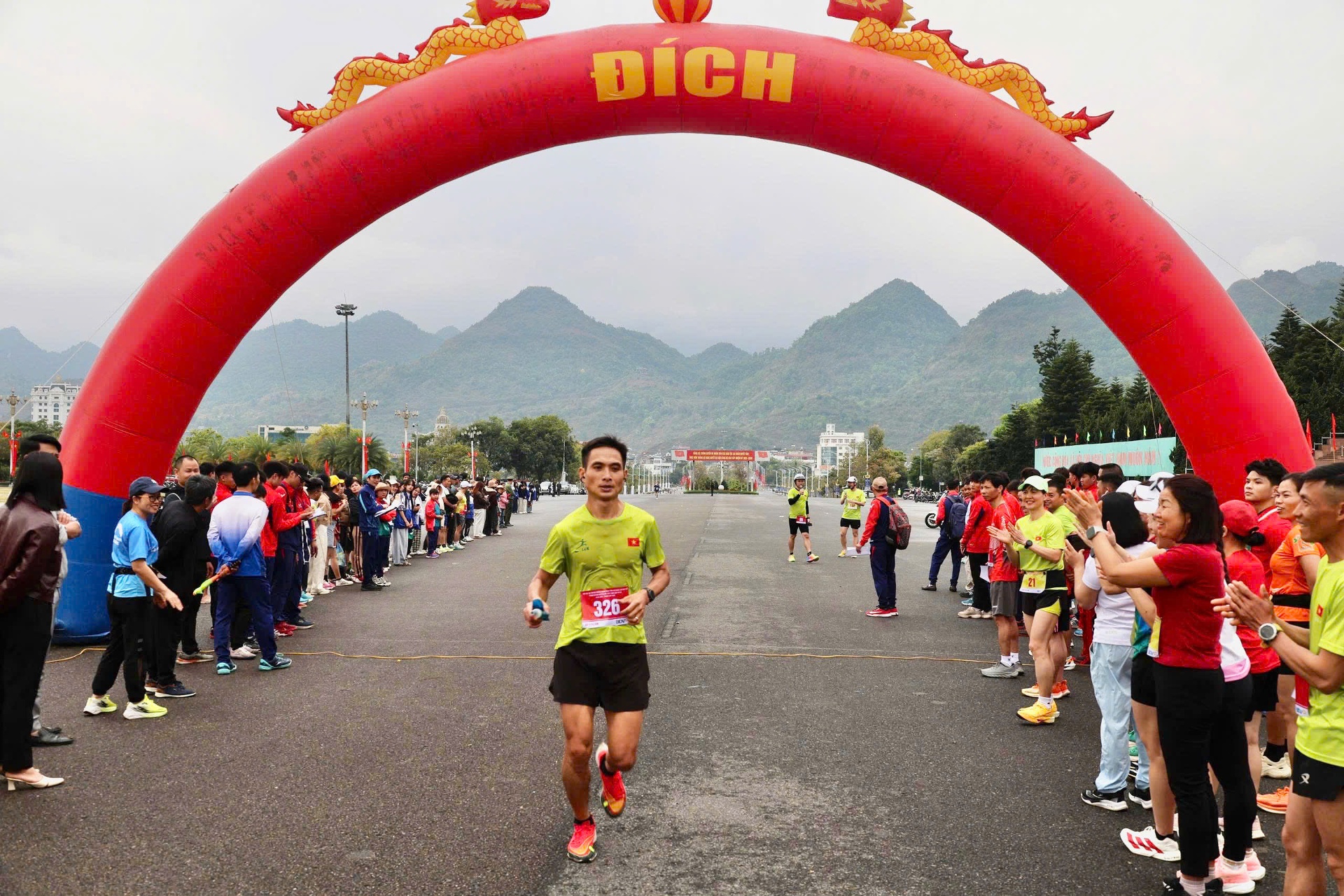 Vận động viên về đích dưới sự cổ vũ của đông đảo người dân.