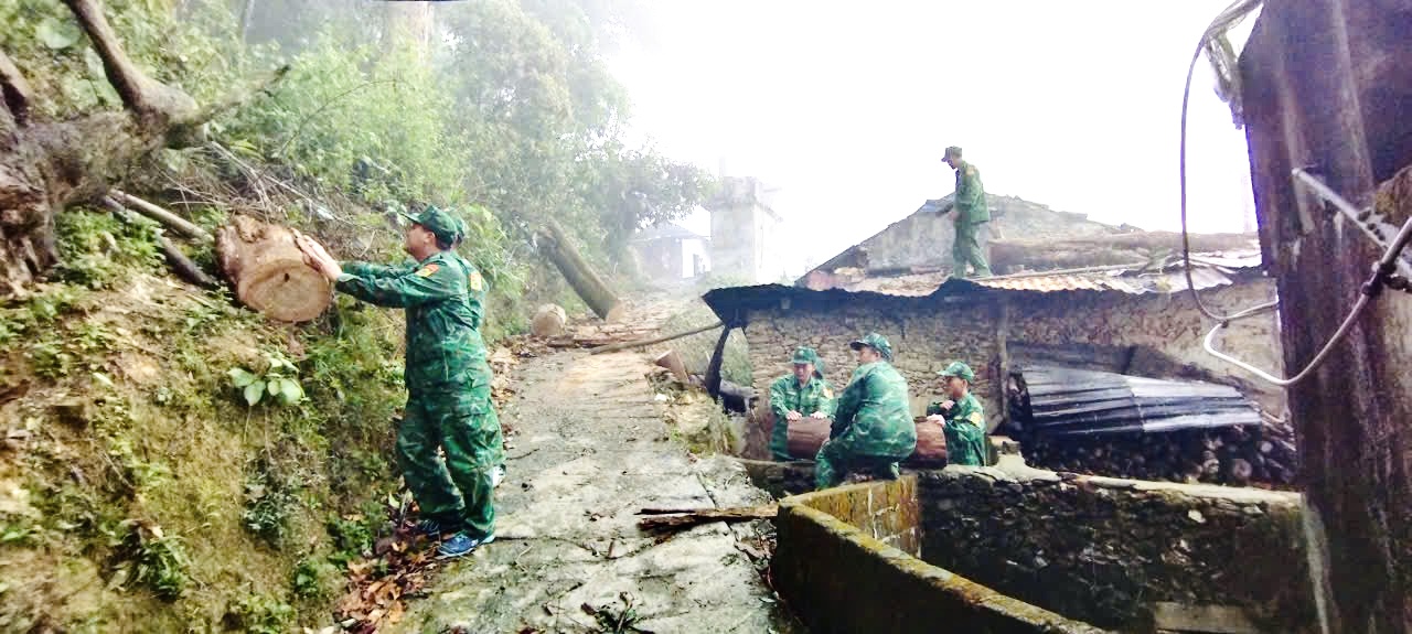 Lực lượng biên phòng giúp nhân dân xã Thu Lũm khắc phục hậu quả do mưa lốc gây ra.