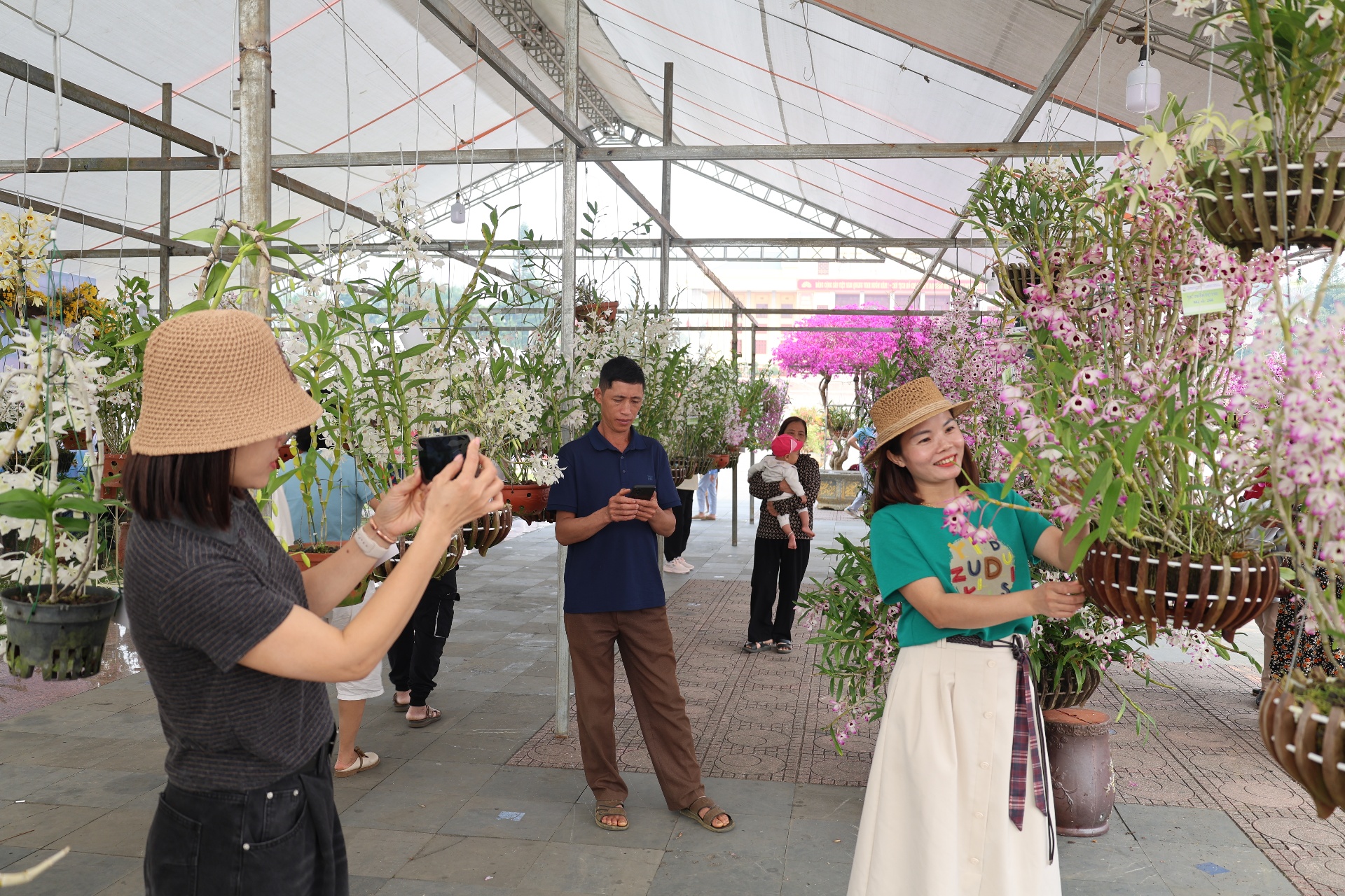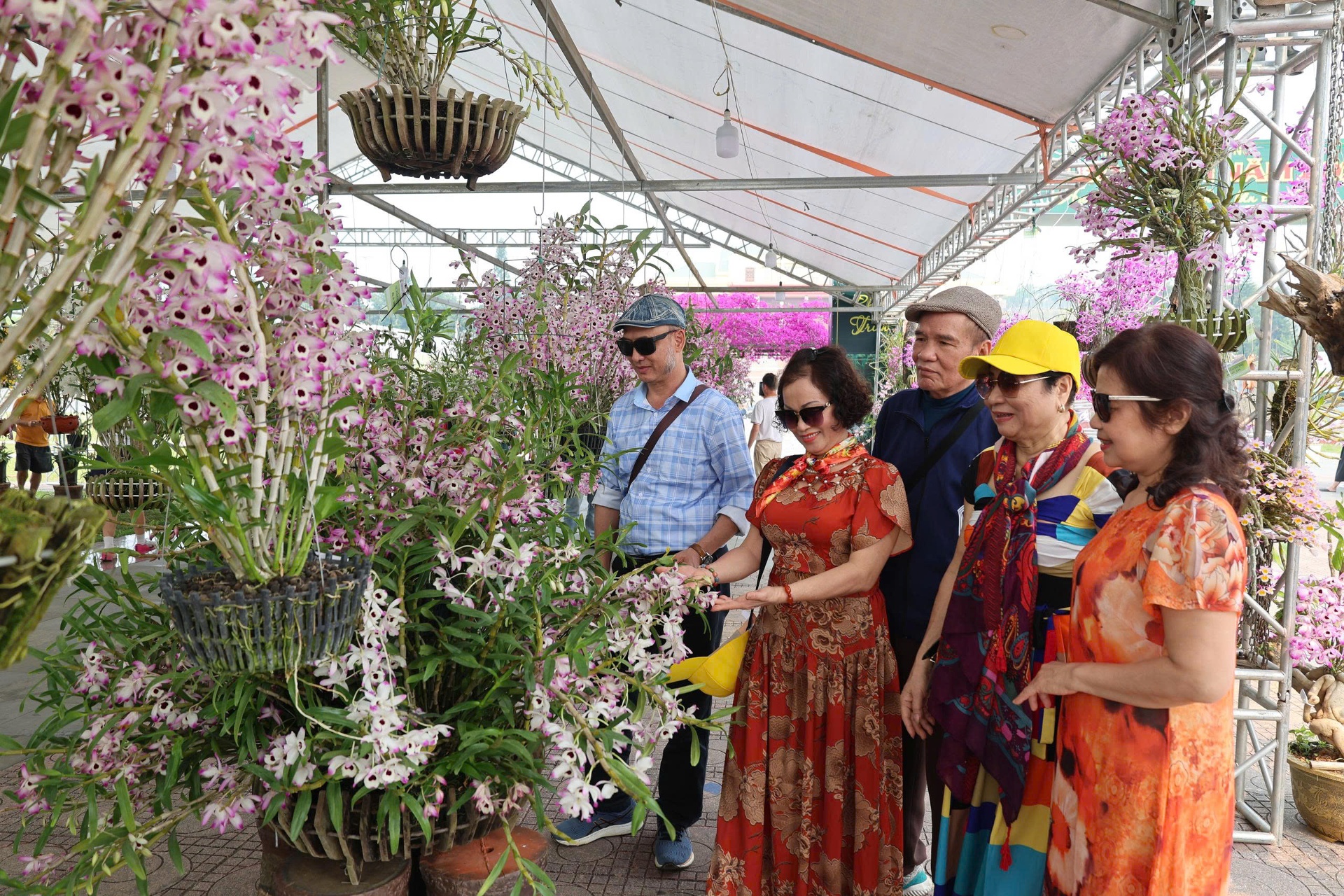 Du khách chụp hình với hoa lan.
