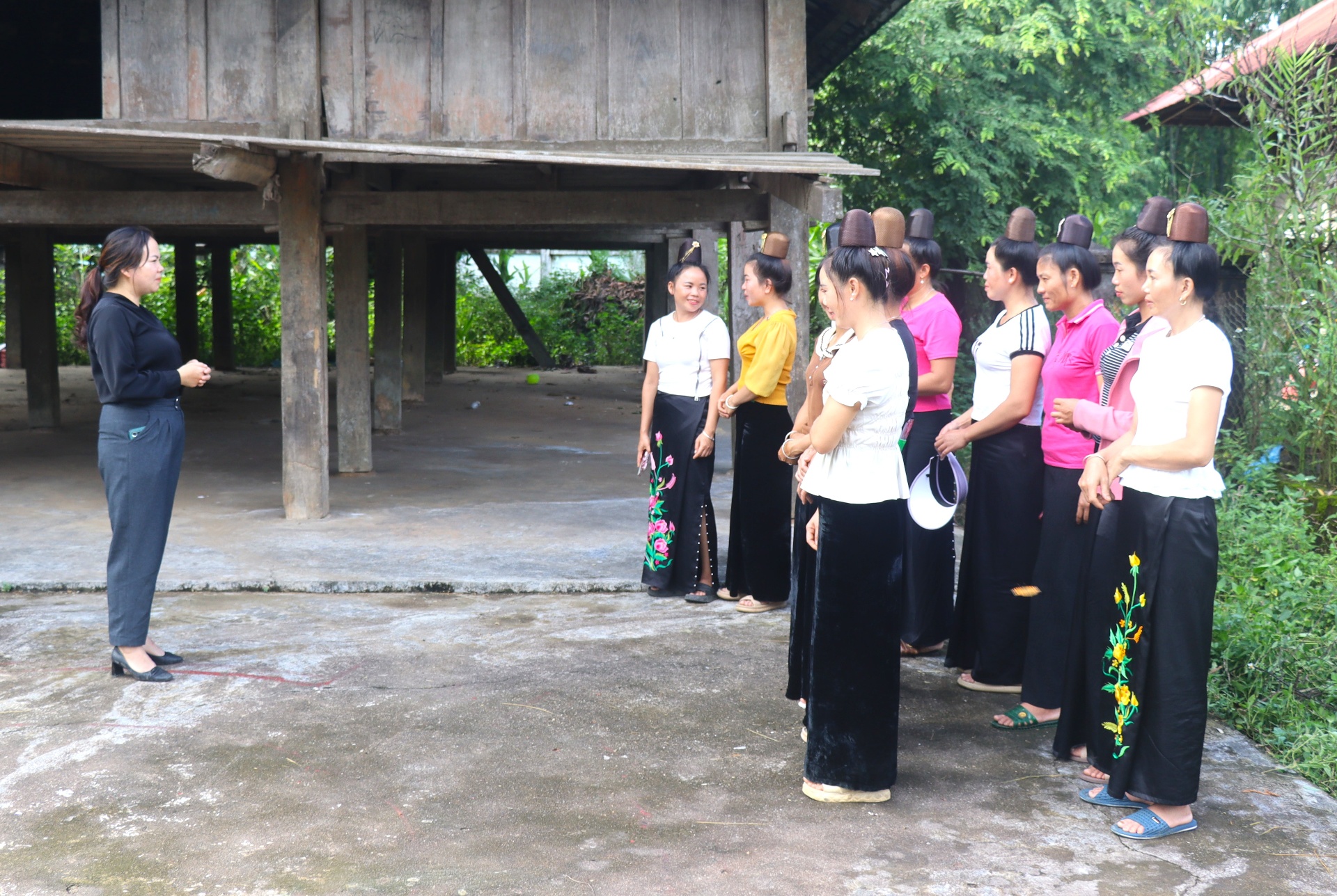 Cán bộ Hội Liên hiệp Phụ nữ xã Hồng Thu tuyên truyền chị em bản Nậm Mạ Thái xóa bỏ hủ tục, tập quán lạc hậu.