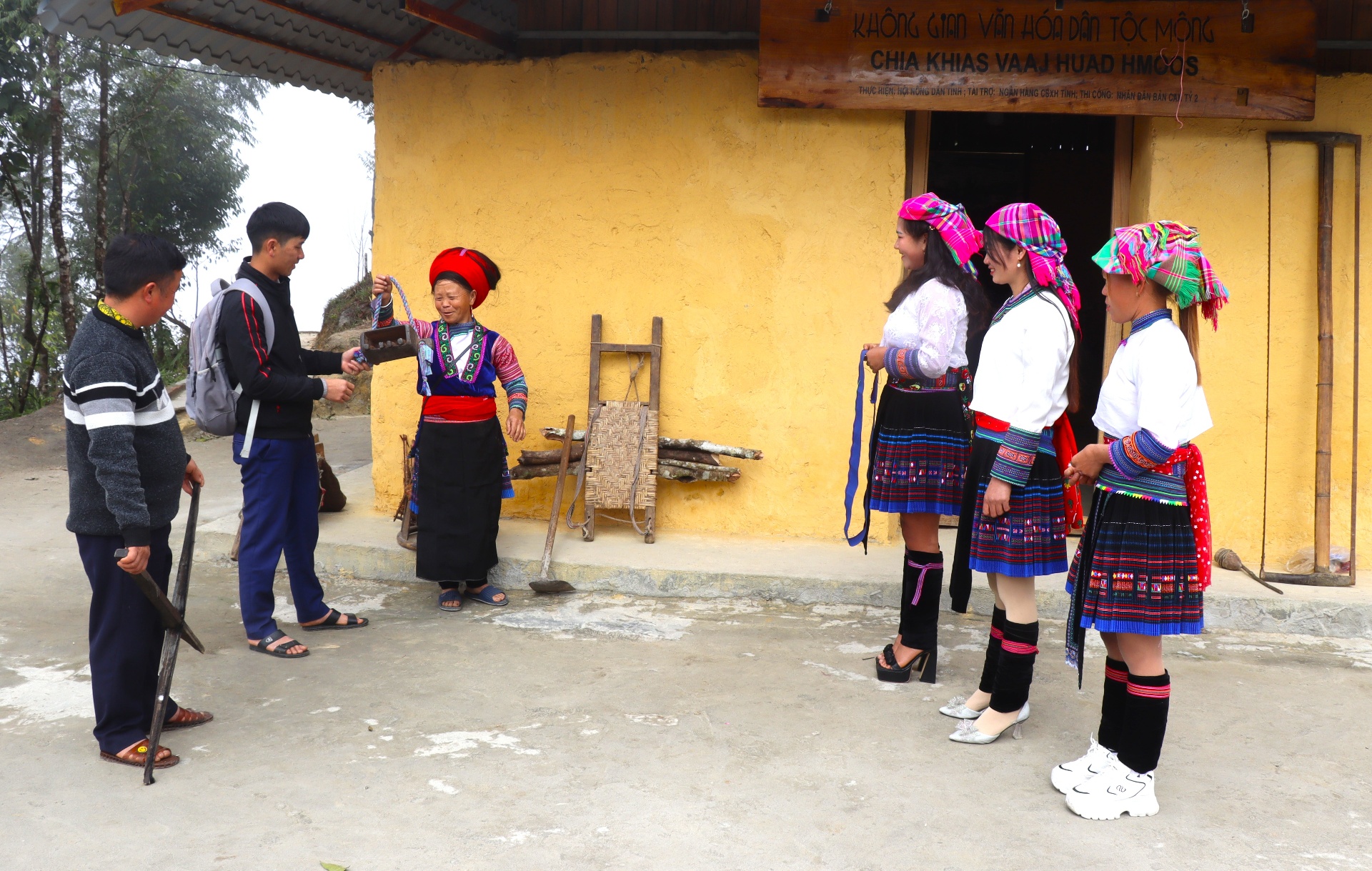 Người dân bản Can Tỷ 2 giới thiệu các vật dụng truyền thống của dân tộc Mông tới khách du lịch.