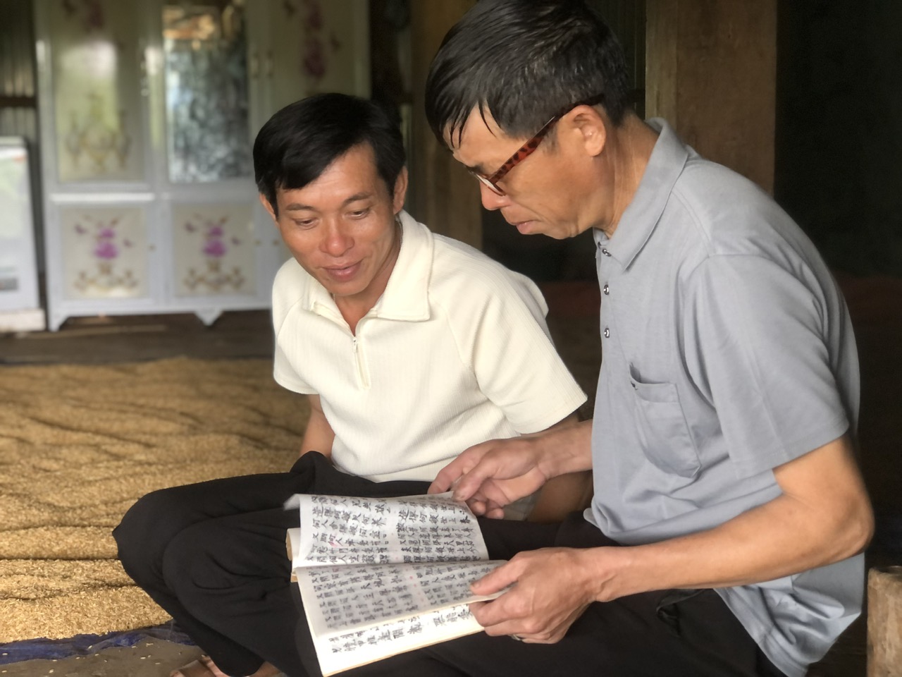 Anh Phàn A Hoanh (bên trái) - Bí thư Chi bộ bản Nậm Chăng đến nhà người già trong bản học chữ viết, nghi lễ truyền thống của tổ tiên.