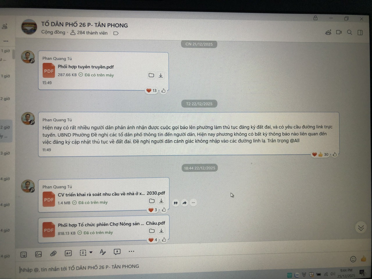 Bên cạnh đó, các tổ dân phố, khu dân cư cần tiếp tục đẩy mạnh công tác tuyên truyền, thông báo kịp thời đến từng hộ dân, nhất là người cao tuổi, người ít tiếp cận công nghệ - những đối tượng dễ trở thành mục tiêu của các chiêu trò lừa đảo. Tại tổ dân phố 26 (phường Tân Phong), sau khi được chính quyền thông tin về tình hình, ông Phan Quang Tú - Tổ trưởng tổ dân phố liền đăng tải nội dung: “Hiện nay có rất nhiều người dân phản ánh nhận được cuộc gọi báo lên phường làm thủ tục đăng ký đất đai và có yêu cầu đường link trực tuyến. UBND phường đề nghị các tổ dân phố thông tin đến người dân. Hiện nay, phường không có bất kỳ thông báo nào liên quan đến việc đăng ký cập nhật thủ tục về đất đai. Đề nghị người dân cảnh giác không nhập vào các đường link lạ” trong nhóm zalo của tổ. Rất may, hiện tại trong tổ chưa có trường hợp nào gặp tình trạng như vậy.