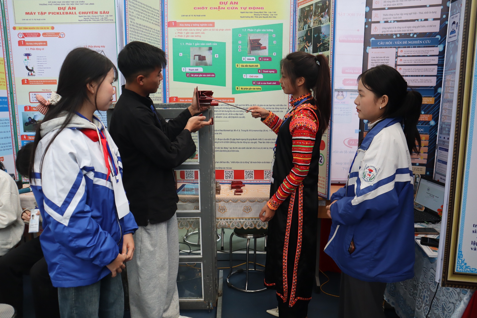 Học sinh Trường Phổ thông Dân tộc Nội trú THPT Ka Lăng giới thiệu dự án chốt chặn cửa tự động.