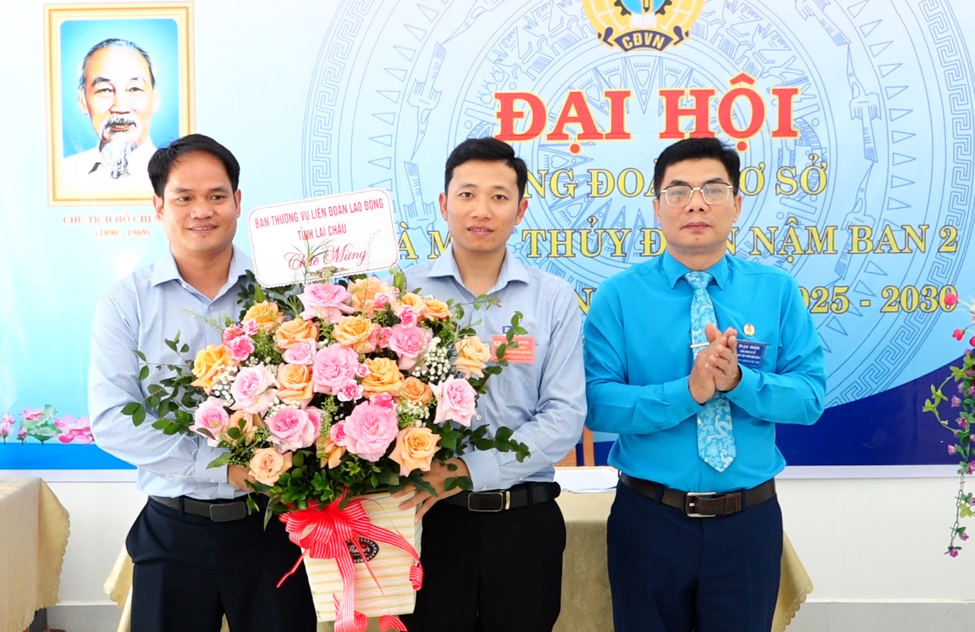 Đồng chí Đàm Xuân Diễn - Ủy viên Ban Thường vụ, Phó trưởng Ban Công tác Công đoàn (Liên đoàn Lao động tỉnh) và lãnh đạo Công ty Cổ phần phát triển điện Đông Dương tặng hoa chúc mừng Ban Chấp hành Công đoàn cơ sở Nhà máy Thủy điện Nậm Ban 2.