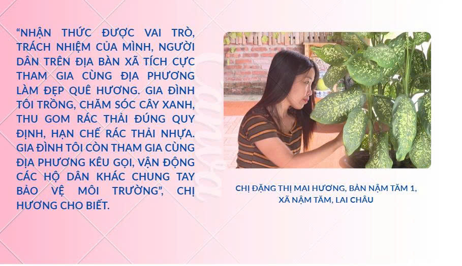 Phát huy vai trò của phụ nữ trong cộng đồng, Hội Liên hiệp Phụ nữ xã đã triển khai nhiều hoạt động thiết thực trong bảo vệ môi trường và xây dựng cảnh quan như: phong trào “Ngày Chủ nhật xanh”, trồng và chăm sóc các tuyến đường hoa; tuyên truyền, hướng dẫn, vận động người dân sinh sống tại 26/26 bản thực hiện phân loại rác tại nguồn, chỉnh trang nhà cửa, vệ sinh chuồng trại.