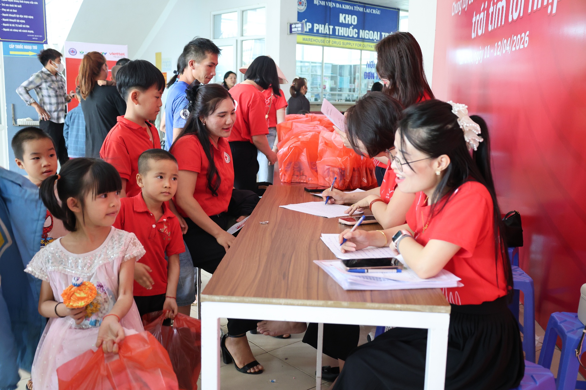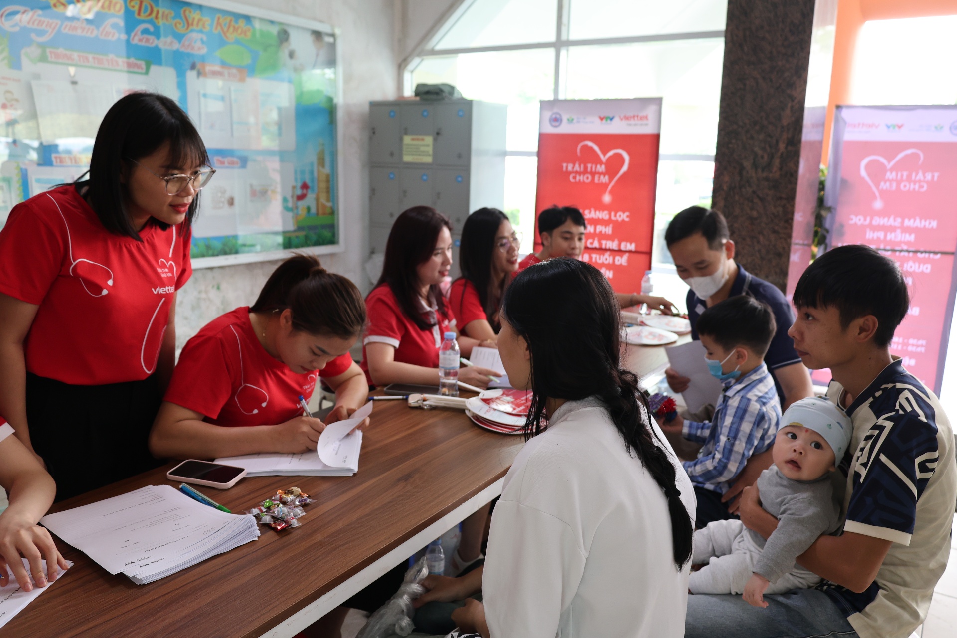 Cán bộ, nhân viên Viettel Lai Châu hướng dẫn nhân dân làm thủ tục khám sàng lọc miễn phí bệnh tim bẩm sinh cho trẻ.