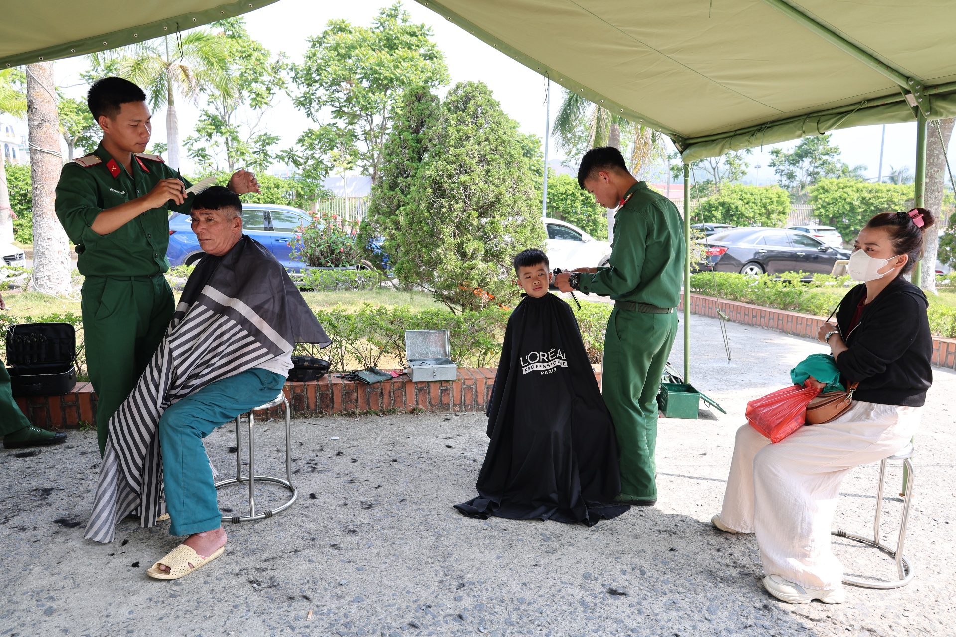 Hoạt động cắt tóc miễn phí tại chương trình khám sàng lọc miễn phí bệnh tim bẩm sinh cho trẻ.