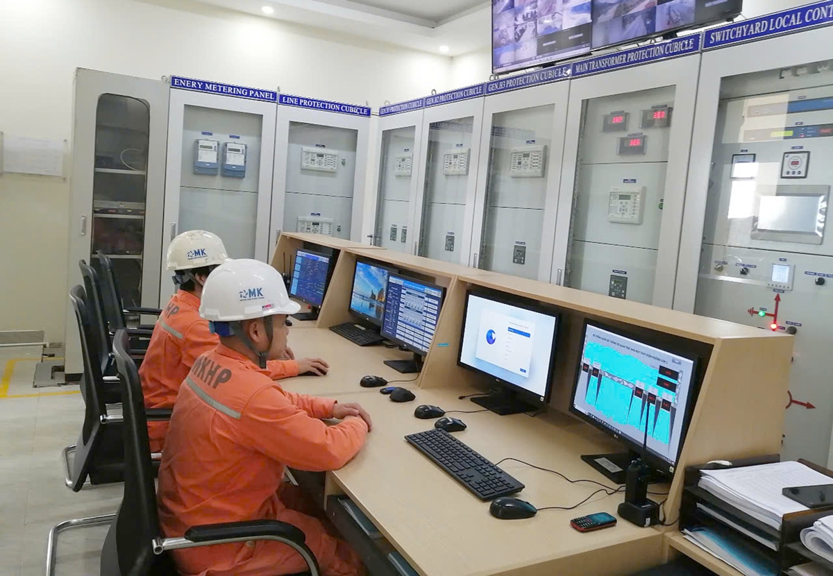 Công nhân Nhà máy Thủy điện Mường Kim II trực vận hành sản xuất điện năng.
